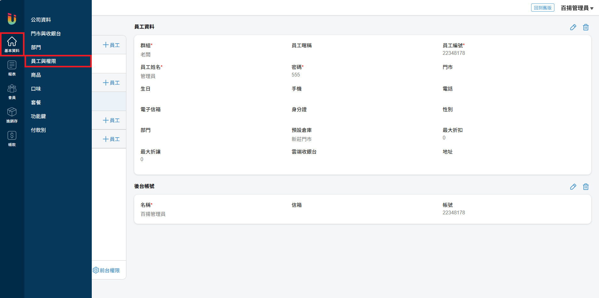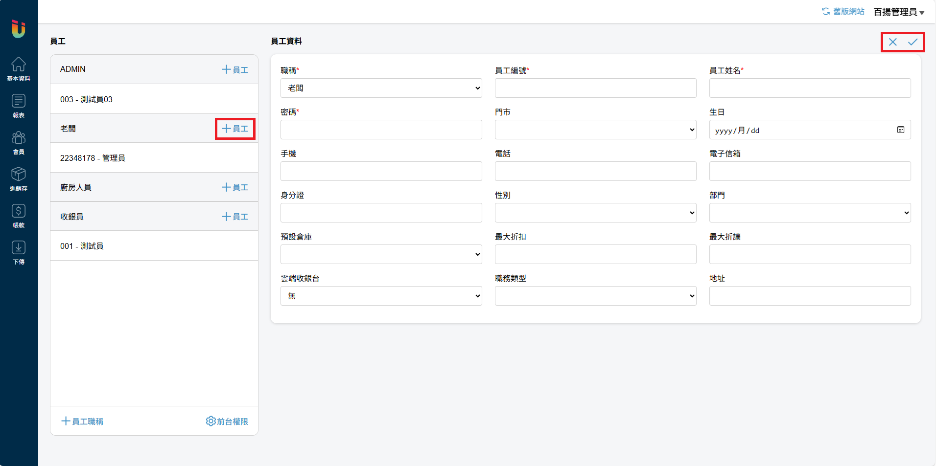 - 特別注意 ! 如果該員工設定 [門市] 或 [門市模組] 則視為該門市的員工,因此只能看見該門市的資料,一旦員工設定門市後將無法再看到其他門市或無門市的相關資料,包含 [員工]、 [倉庫]、[報表]…等等,也無法自行將門市設定移除,只能藉由無門市的更高權限員工帳號才能調整,因此建議至少保留一位未設定任何門市的最高權限管理員。