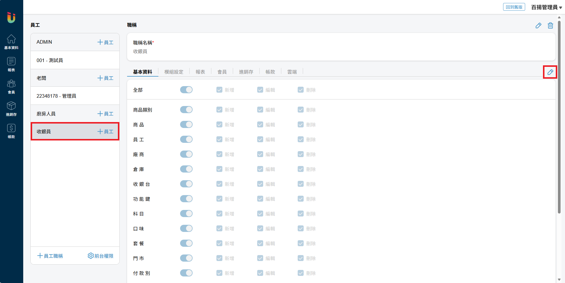 於 [員工與權限] 頁面點擊欲修改權限的職位,並點擊 [編輯鈕] 進行權限編輯。