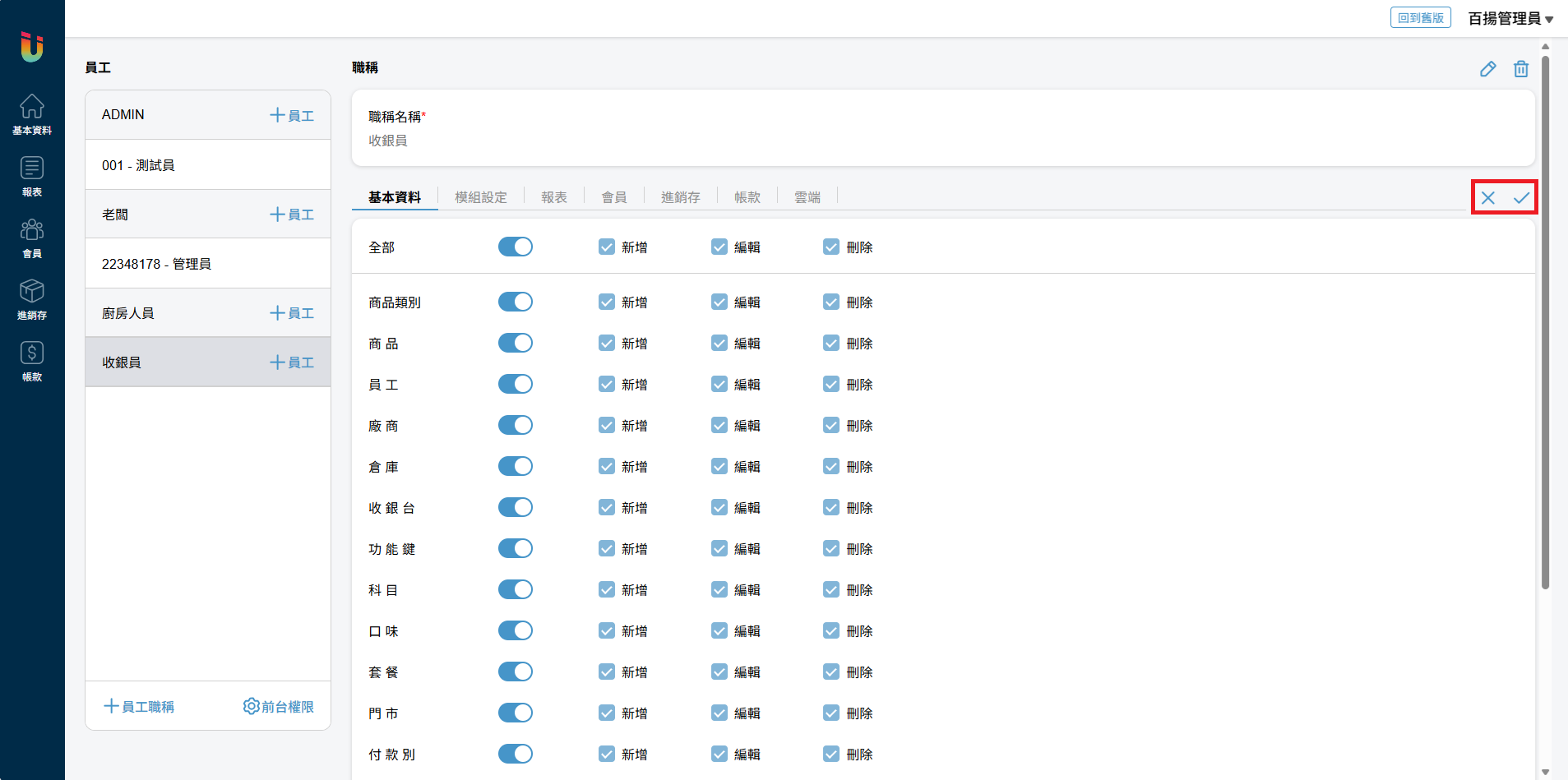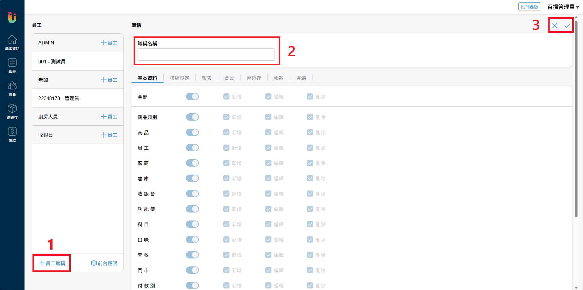 員工的權限與職位相關,建立職位後可以對該職位的權限進行調整。