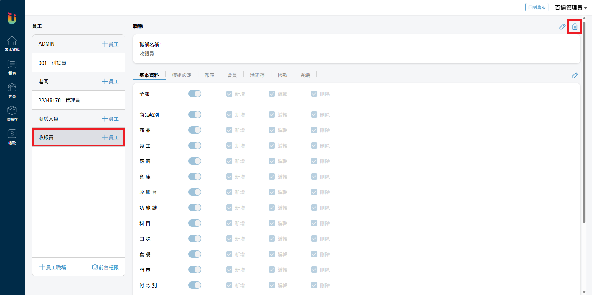 - 刪除職位並不會將該職位的所有員工連帶刪除,該職位底下的員工將會全部移至 [ADMIN] 預設職位底下