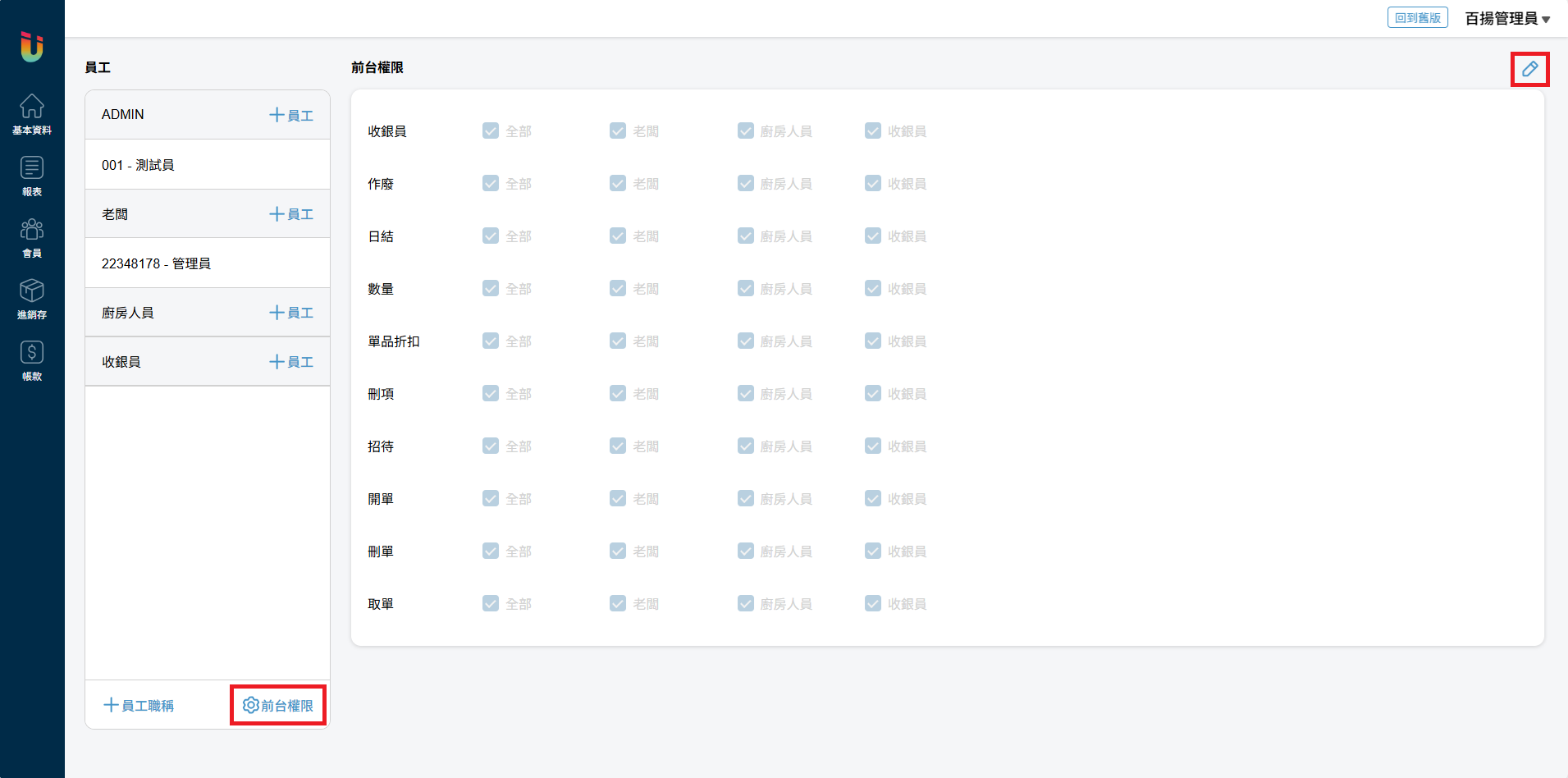 於 [員工與權限] 頁面點擊左下方的 [前台權限],並點擊 [編輯鈕] 進行權限編輯。