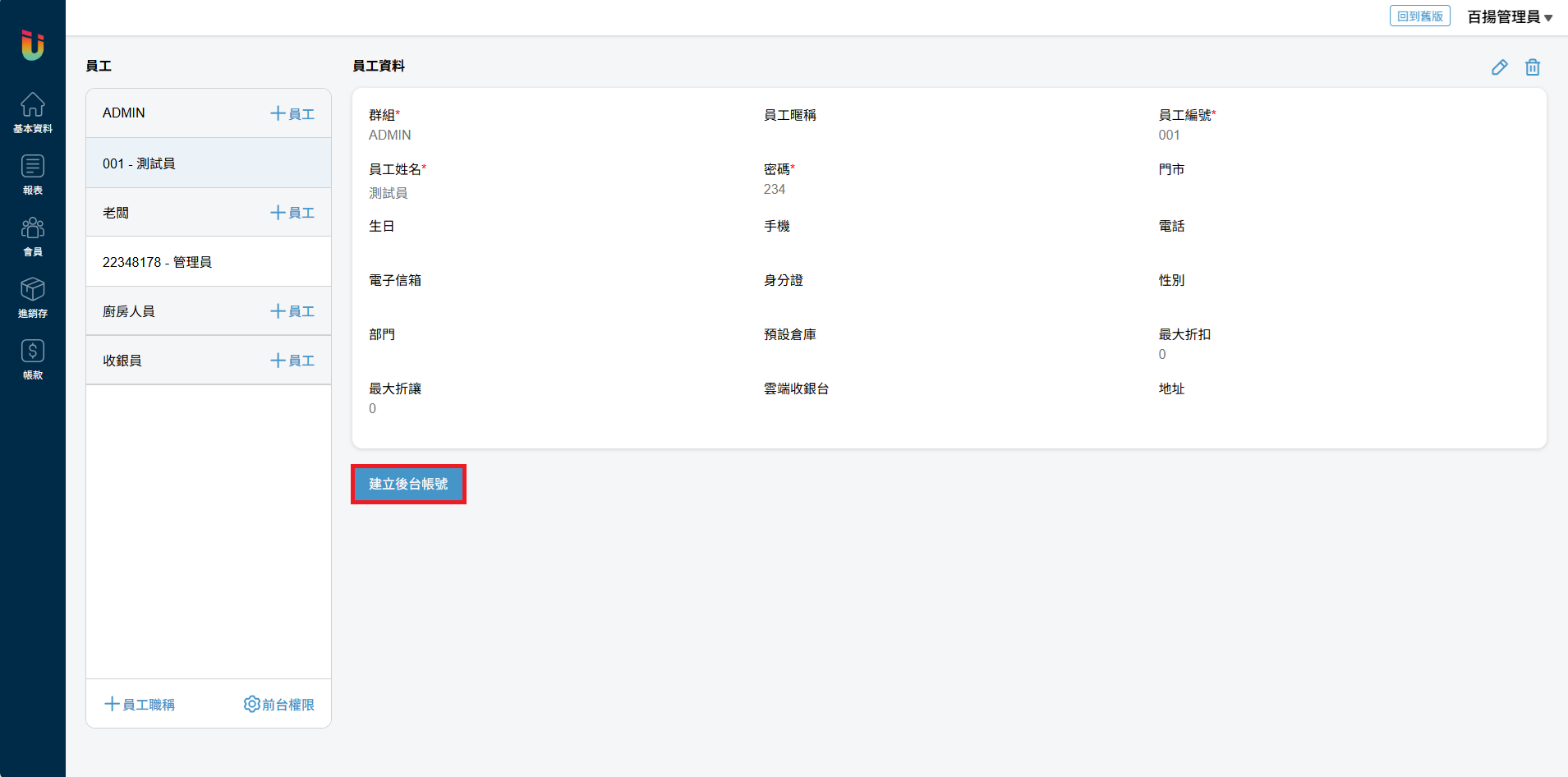 在建立完員工後點擊該員工底下的 [建立後台帳號] 按鈕即可註冊雲端後台帳號
