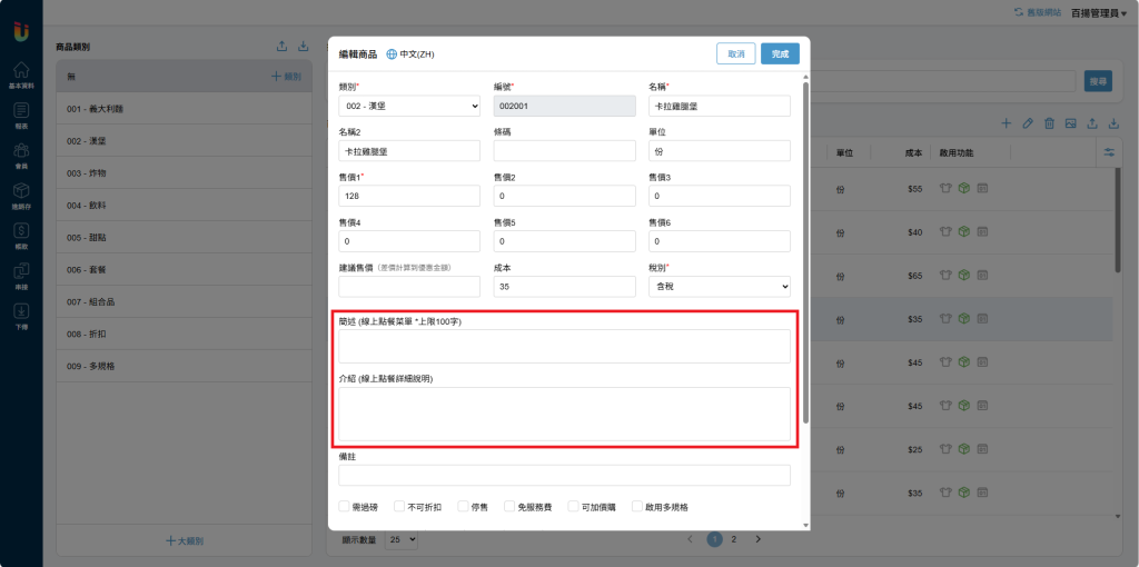 商品可以輸入在 [線上點餐] 上顯示的 [簡述] 和 [介紹]。