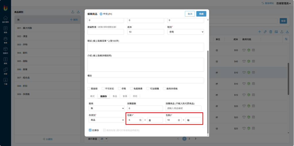 舉例: 可樂為單瓶賣,但進貨時會一次進貨一箱,假設一箱有10盒,一盒有6瓶,則於 [包裝1] 輸入 [6瓶] = [盒],[10盒] = [箱]