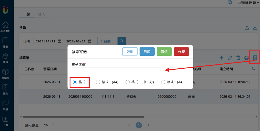 開立發票後若再次點擊右方的 [發票] 圖示,則可以 [列印] 、 [寄送]、[作廢] 發票,若要改變預設的發票格式,請參 [店面管理] > [01 公司設定] > [單據設定]。