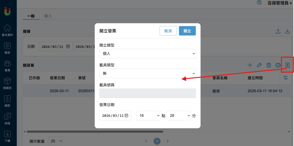 完成 [銷貨單] 後如有開立發票的需求,選擇欲開立發票的 [銷貨單] 點擊右方的 [發票] 圖示即可開立發票。