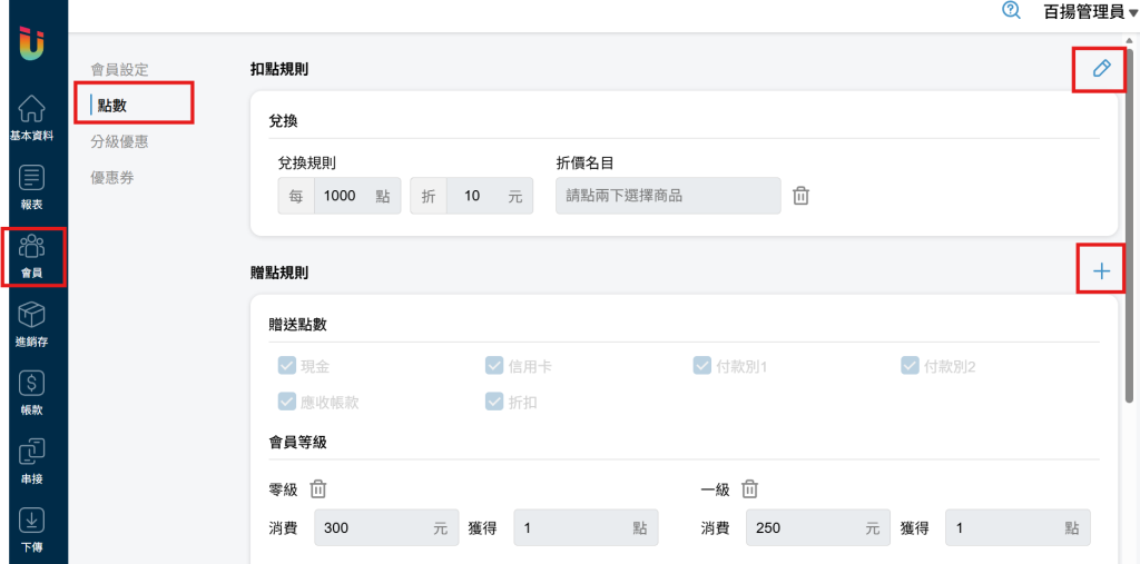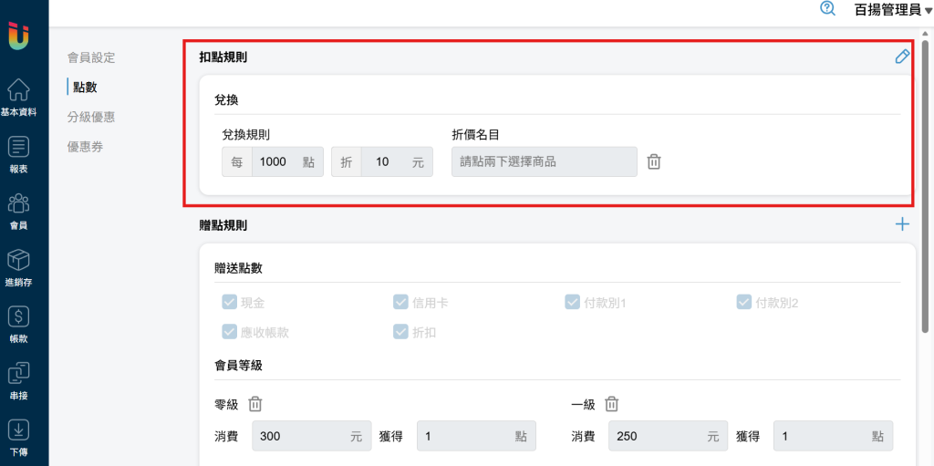 點擊 [扣點規則] 右方的鉛筆按鈕,可以編輯點數與折價的兌換比例。