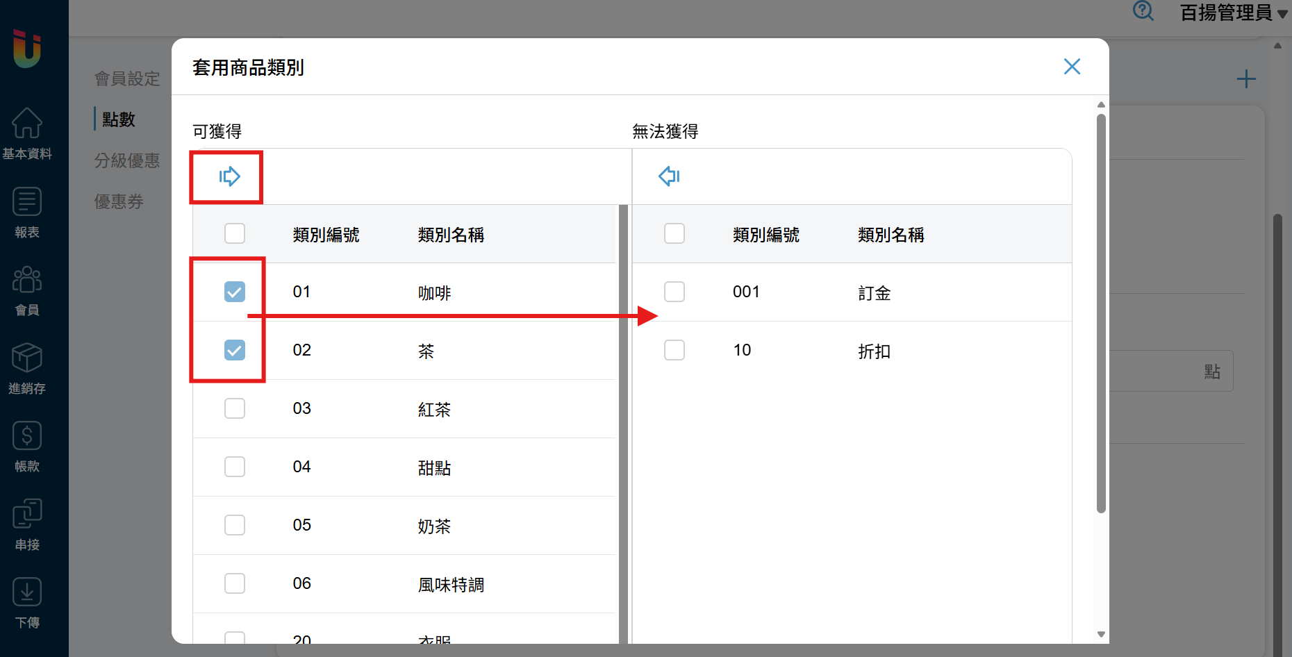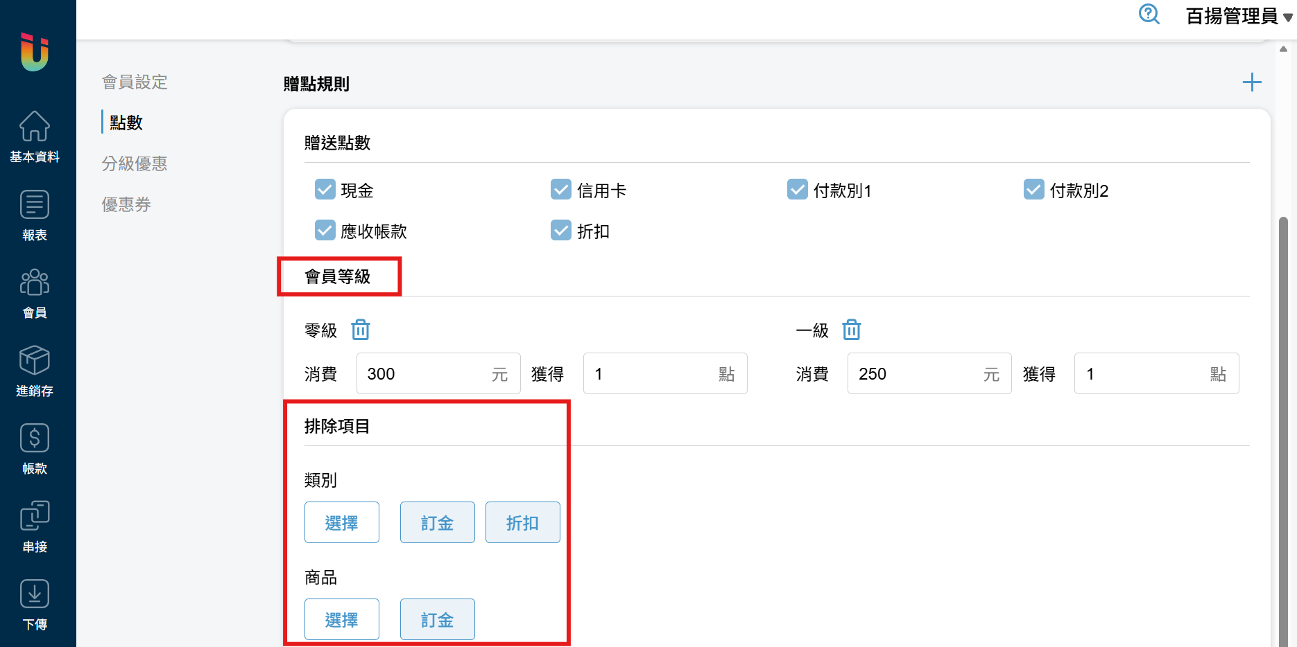 [排除項目] 則可設定無法獲得積點的類別或商品。