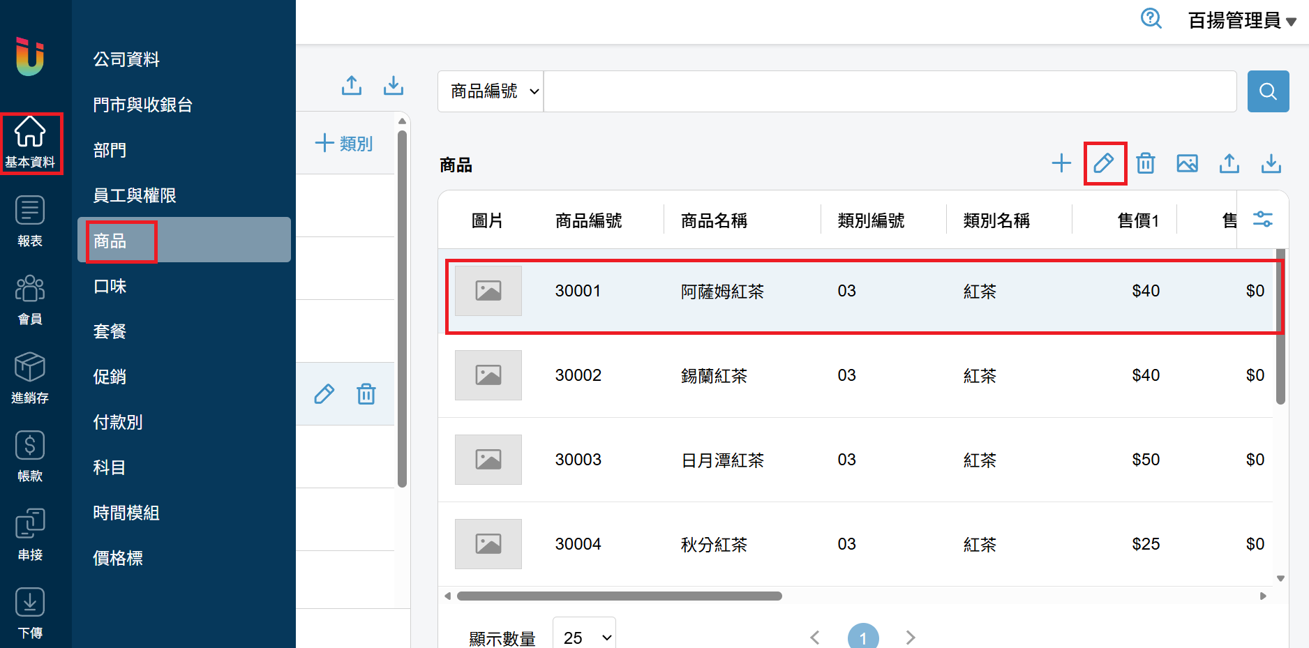 於左方列表點選 [基本資料] > [商品] 選擇欲設定的商品,點擊右上角鉛筆按鈕進行編輯。
