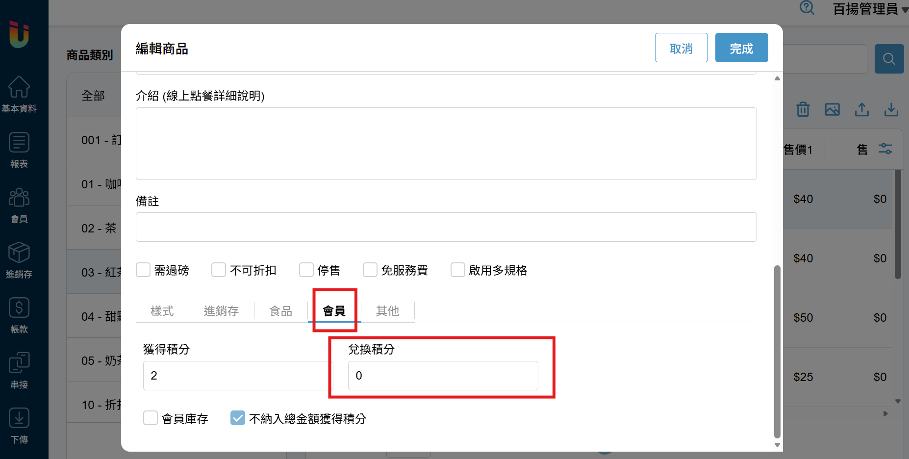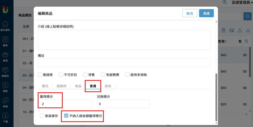 勾選 [不納入總金額獲得積分] 可以設定該商品,不在計入單筆消費總額所贈送點數的計算內,僅獲得單品額外贈點。