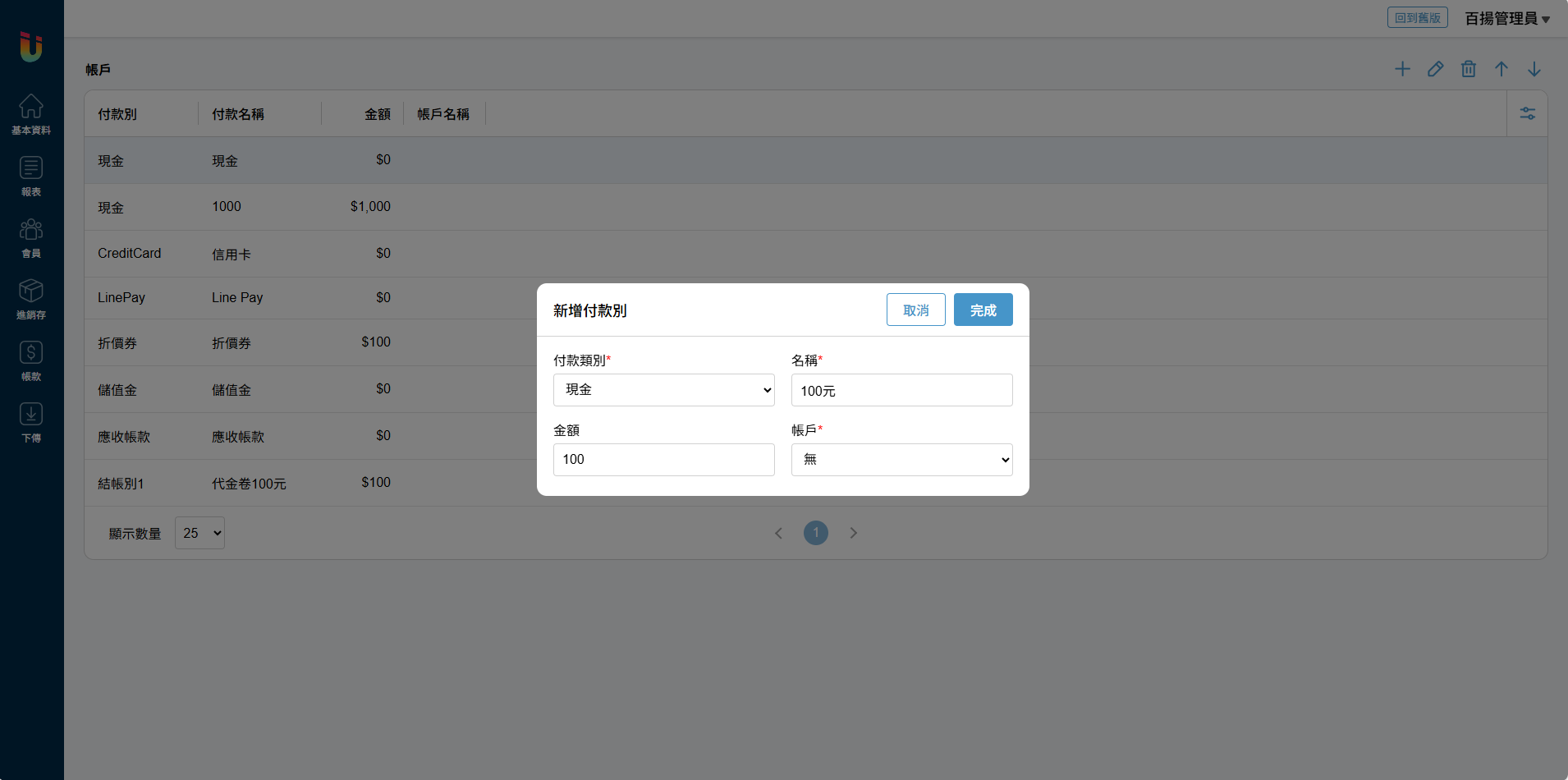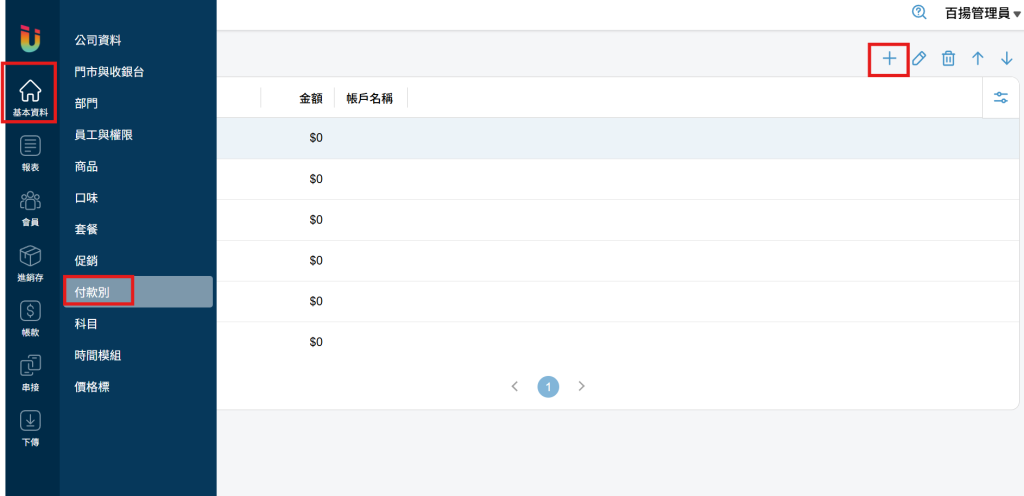 其中 [付款別1] 和 [付款別2] 可以在雲端後台 [公司] 頁面將其名稱更改為自己所需的名稱做客製化使用,例如可以將 [付款別1] 改名稱為 [代金卷] ,則當客人持代金卷進行結帳時即可使用 [結帳別1] 紀錄代金卷的使用狀況。