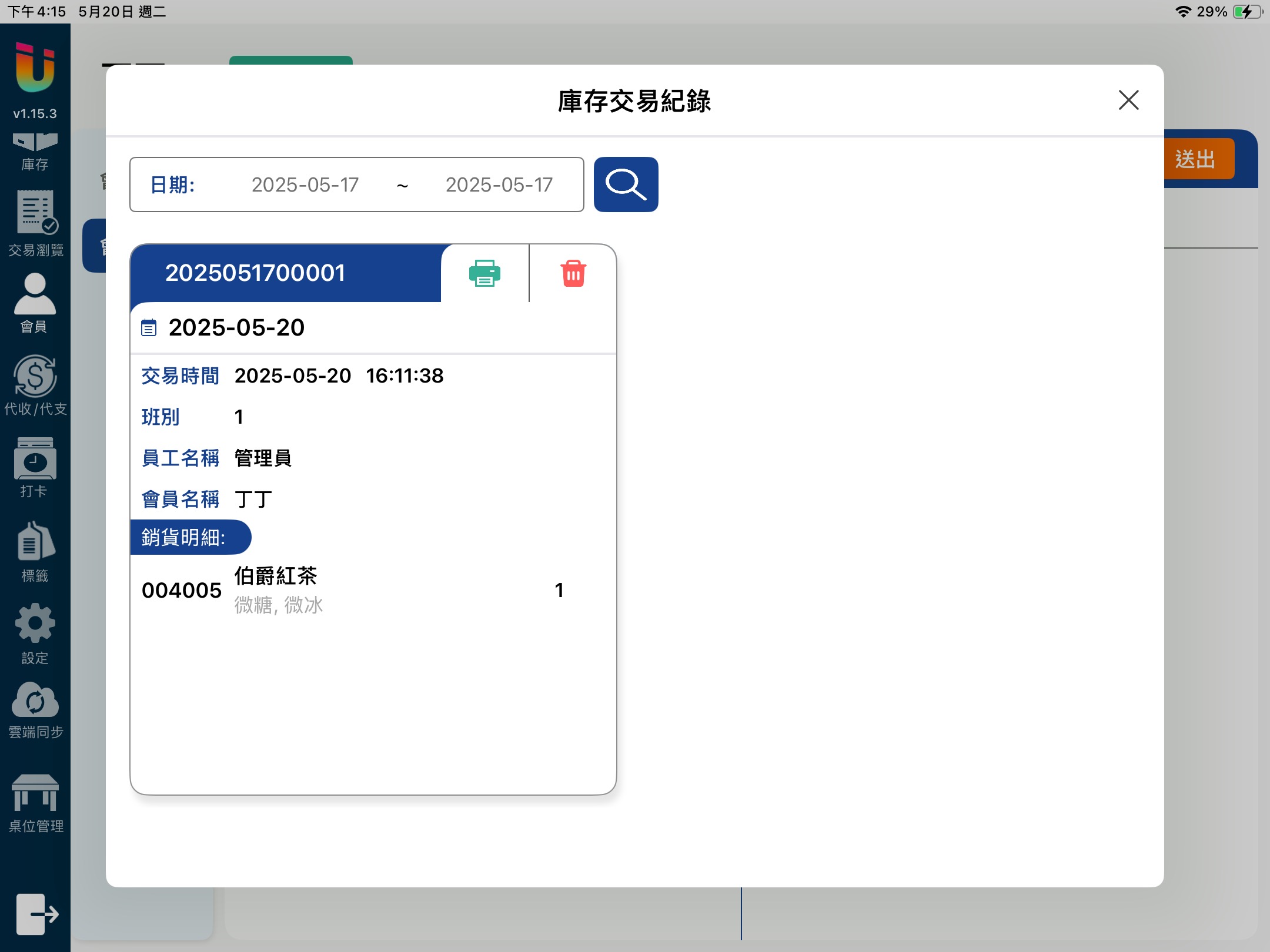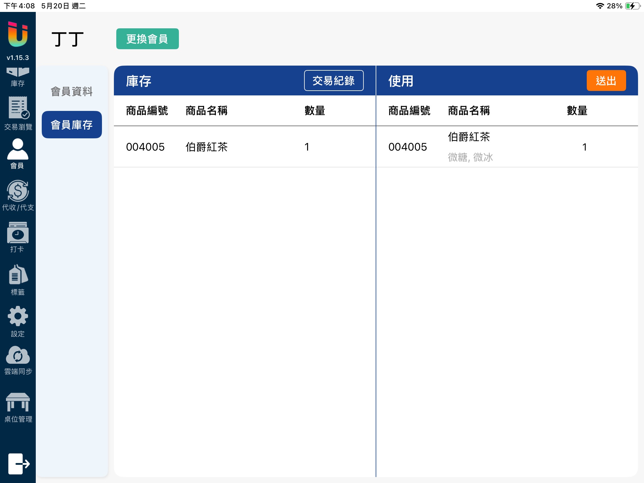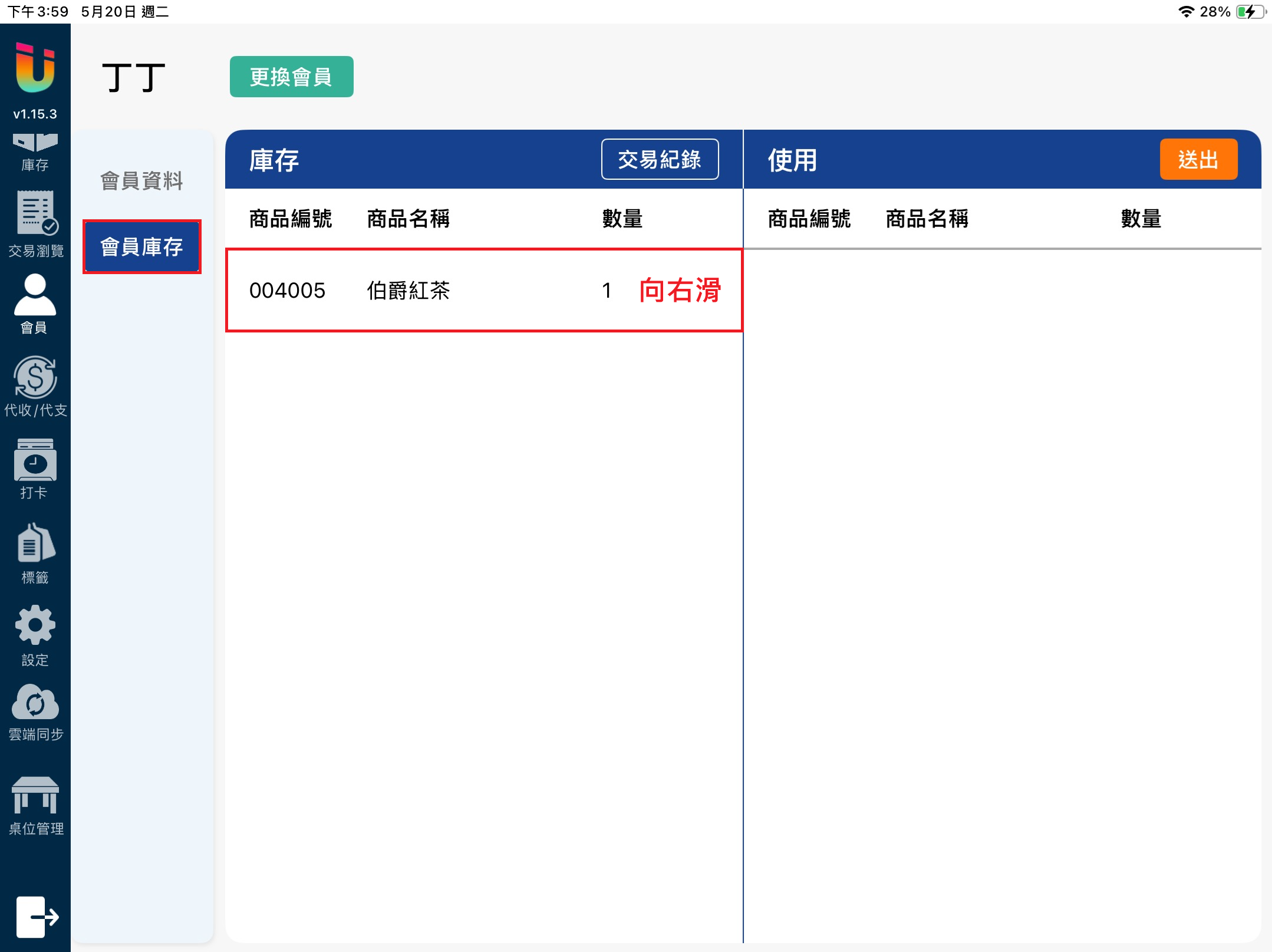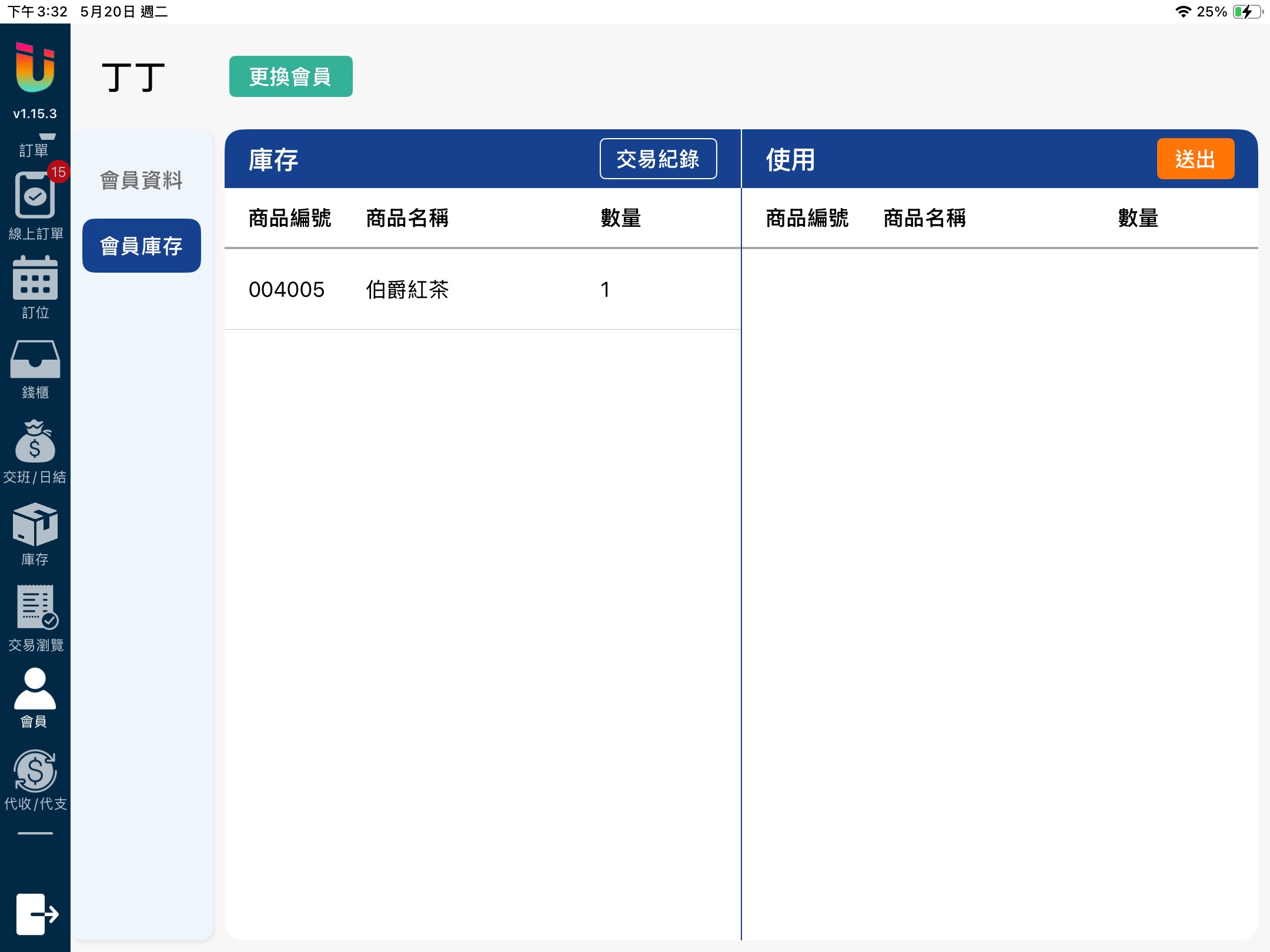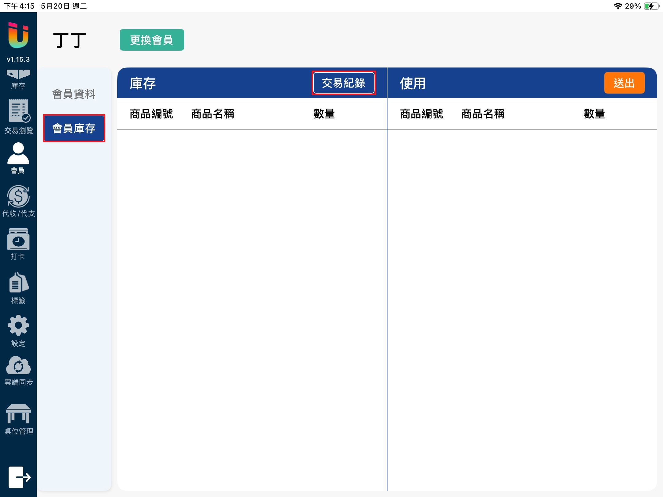 前台Pos 左方 [功能表] 點選 [會員] 搜尋找到該會員後,左側從預設的 [會員資料] 點選到 [會員庫存] 即可看到尚未兌換的庫存紀錄。
