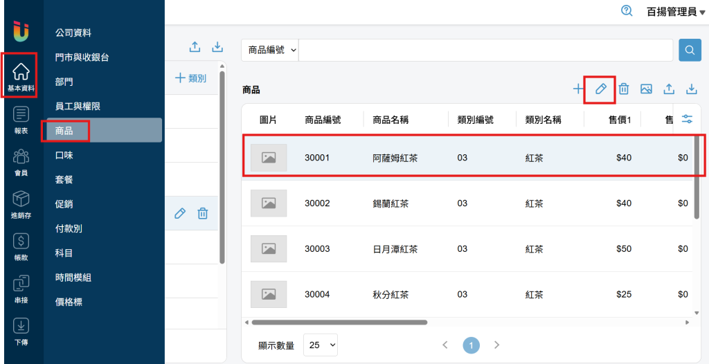 於左方列表點選 [基本資料] > [商品] 選擇欲設定的商品,點擊右上角鉛筆按鈕進行編輯。