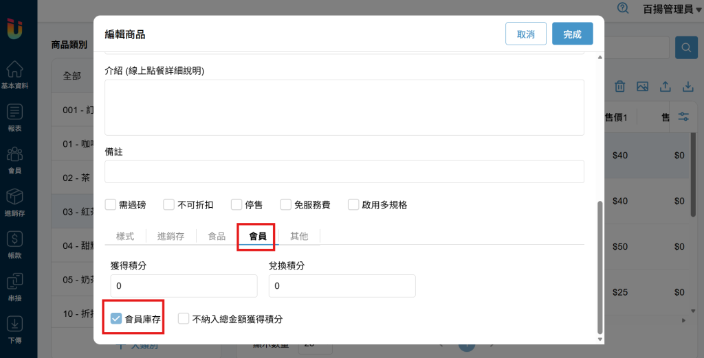 最下方的分類點選 [會員] 並勾選 [會員庫存],只要此商品在購買時有帶入會員,則會自動將此商品加入 [會員庫存]。