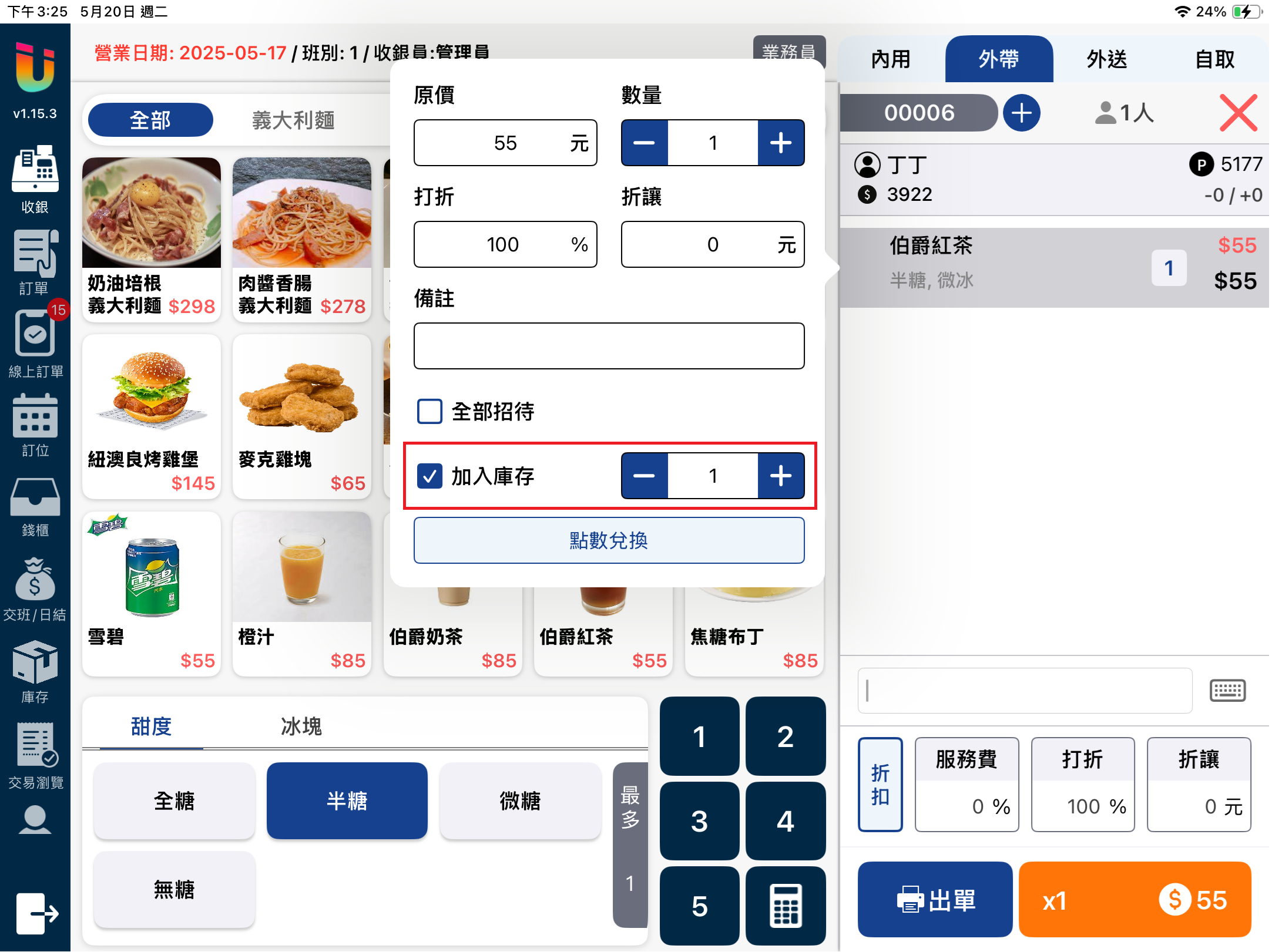 於前台 [收銀] 頁面將欲存入的商品加入購物車後,於購物車雙擊此商品並於彈窗勾選 [加入庫存] 並選擇加入數量,結完帳後該商品即可存入此會員的 [會員庫存] 內。