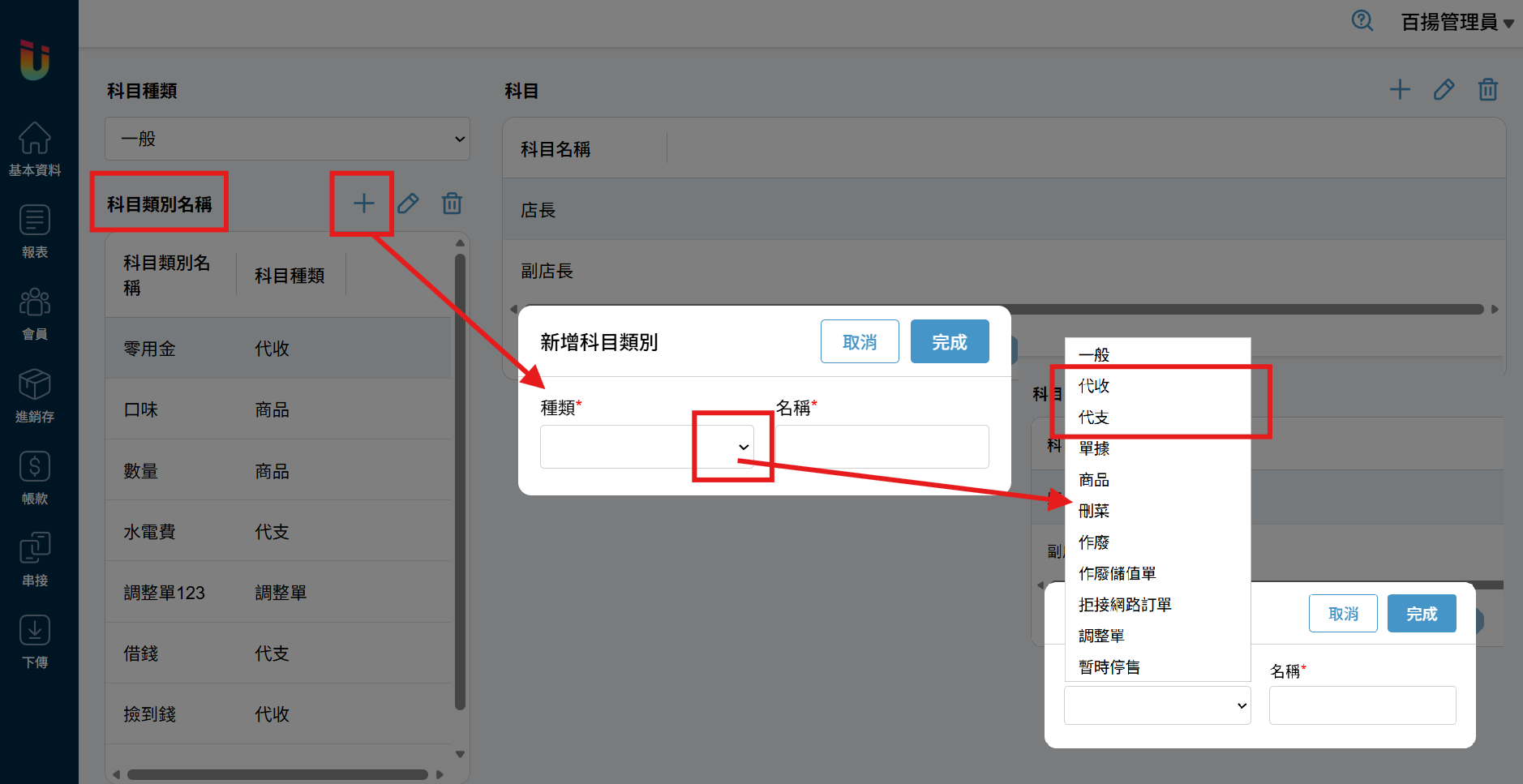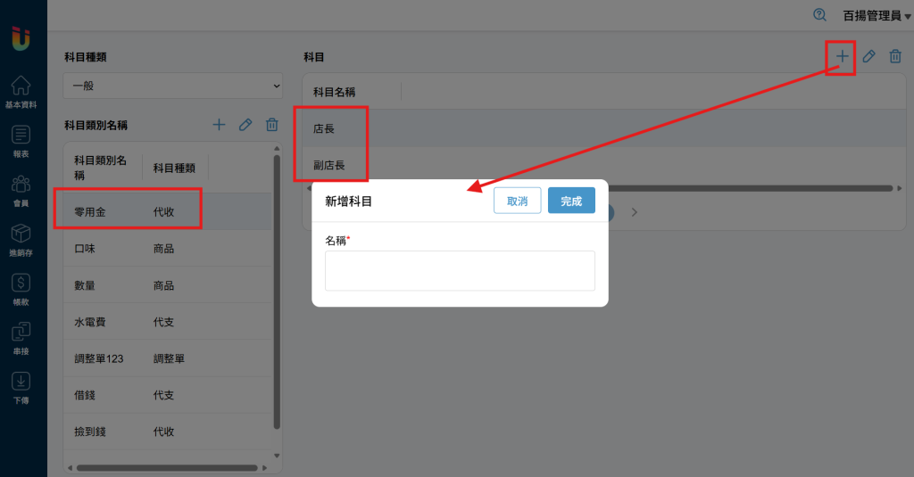 舉例:勾選 [代收] 此種類並新增名稱 [零用金],右上角 [+] 新增科目細項 ,可再度輸入零用金,或來源自店長、副店長等。