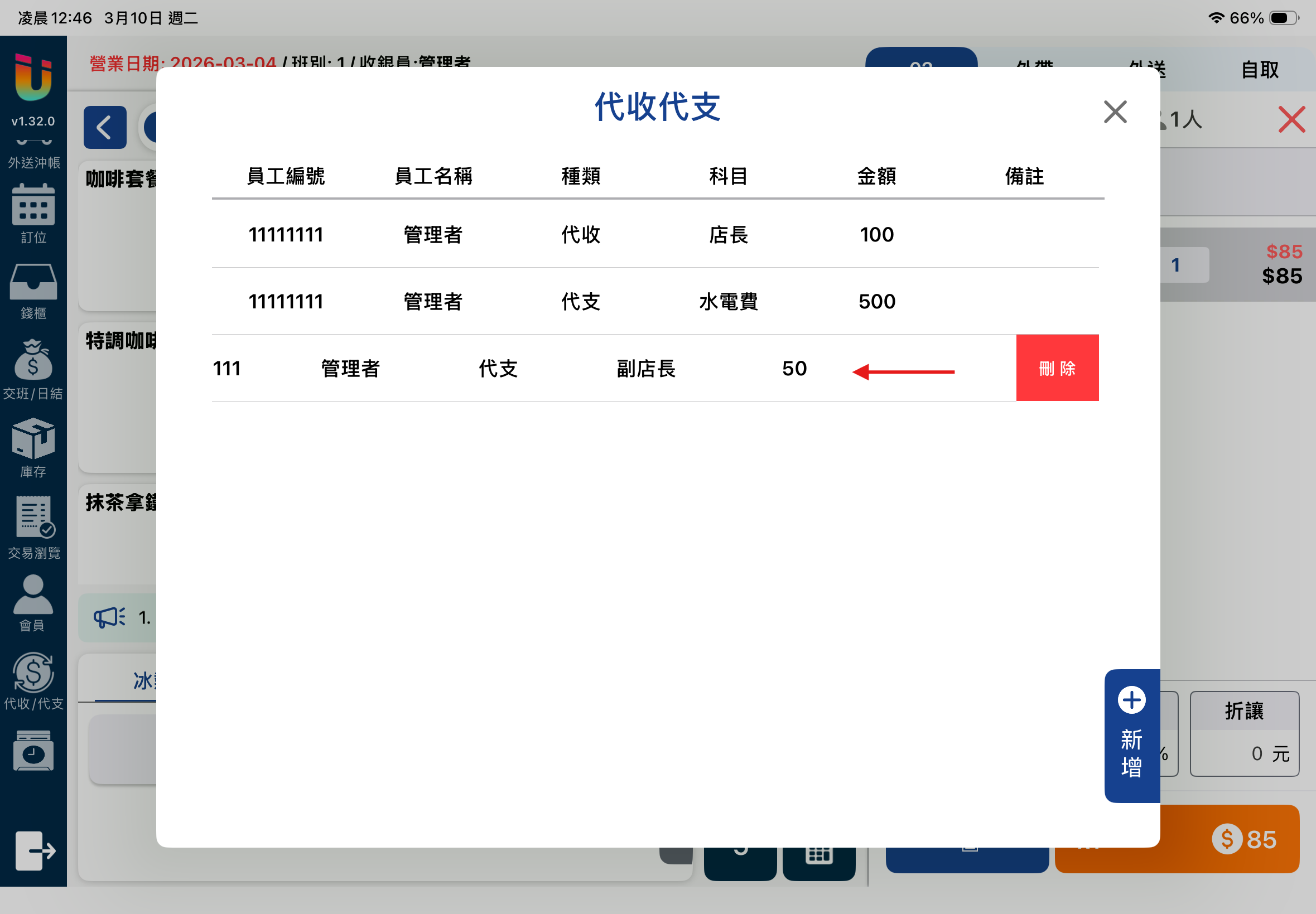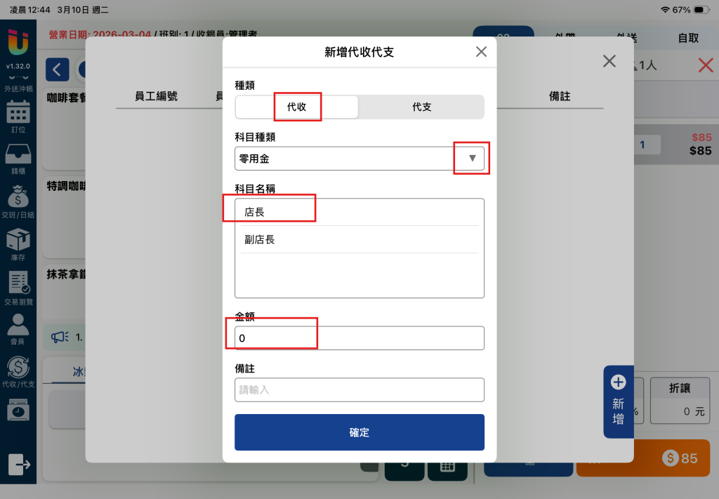 例如:瓦斯用完了,叫瓦斯後需要使用錢櫃的錢來代支,於 [代收代支介面] 即可紀錄 [代收] 和 [代支] 的情形,並於 [完整日結] 對帳時顯示出來。