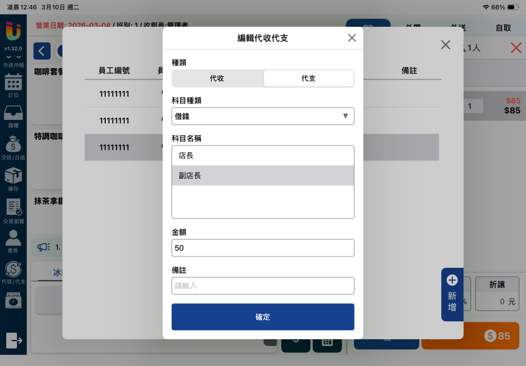 在營業時偶爾會有特殊情況需要 [代收] 或 [代支] 金額。