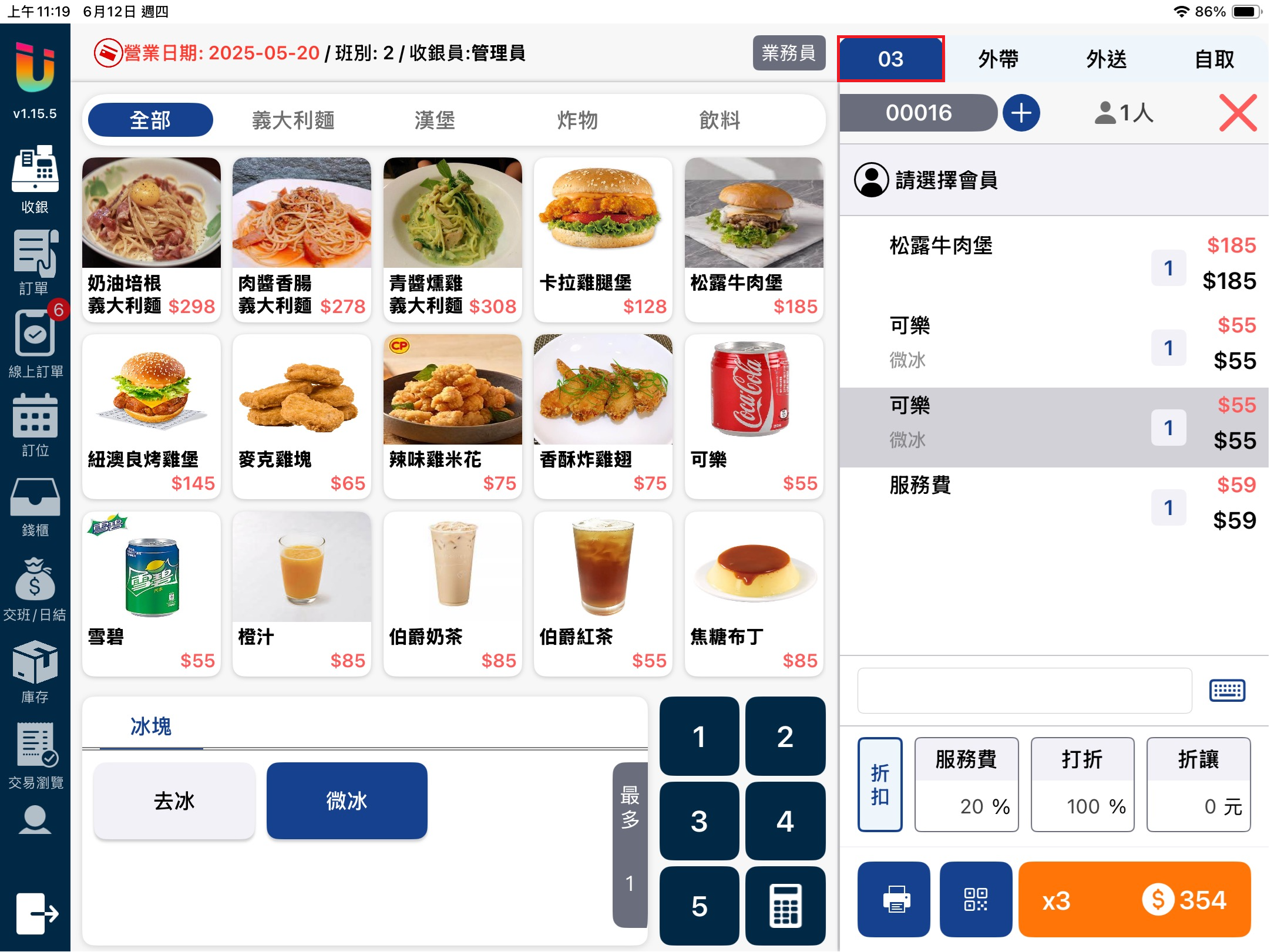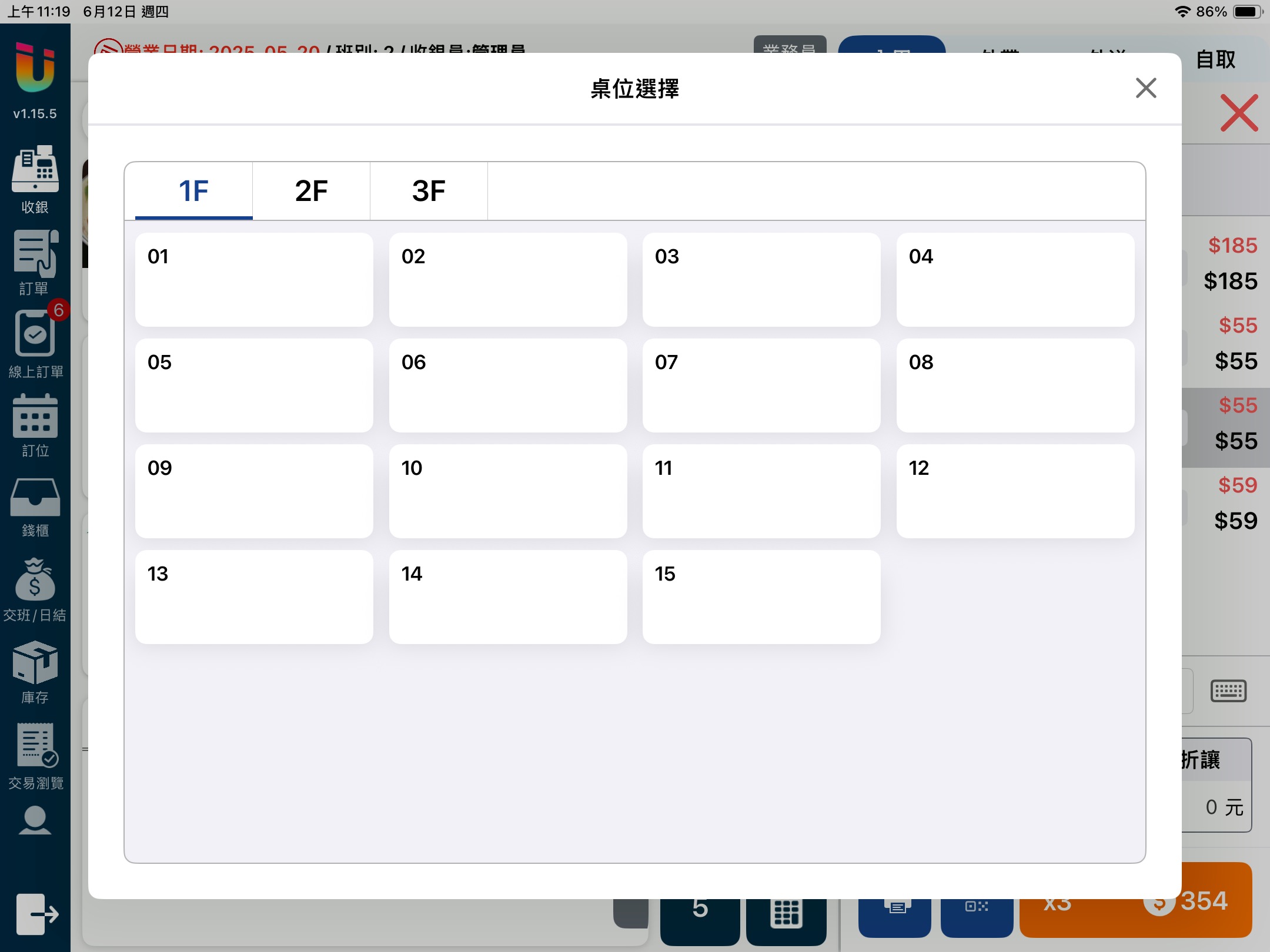 選擇 [桌號] 後,原用餐別的 [內用] 字樣將會改成顯示桌號來提示該單據是哪個桌位的內用單。