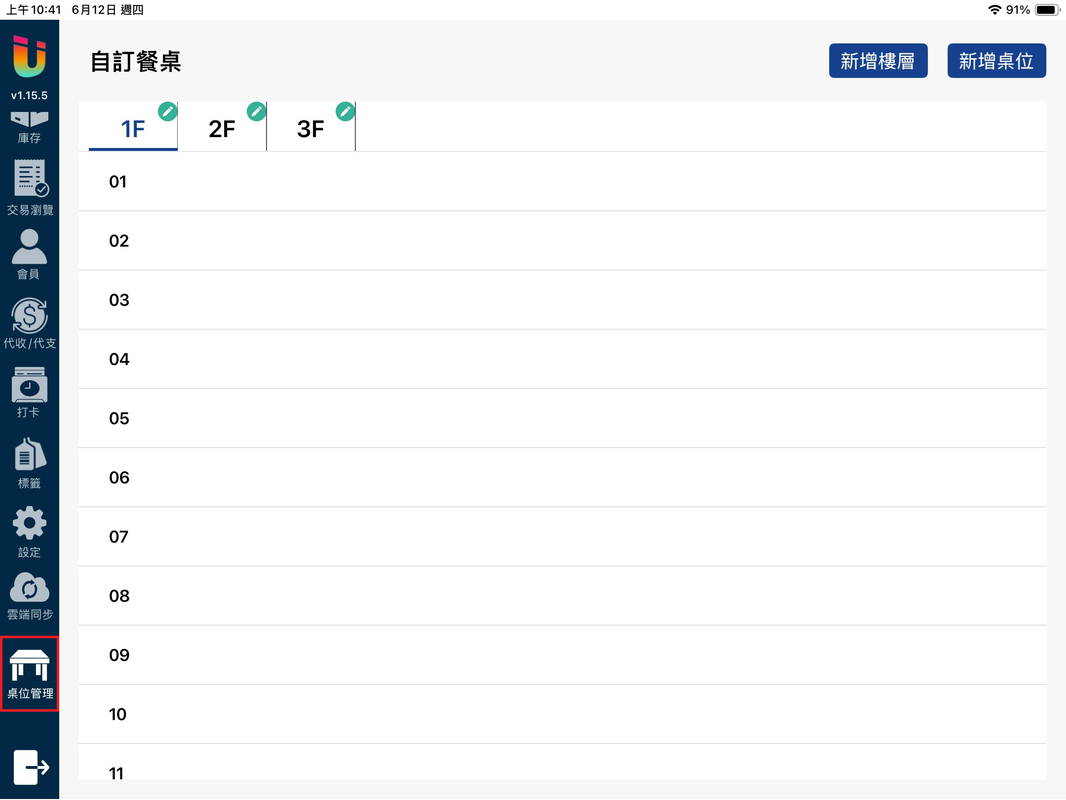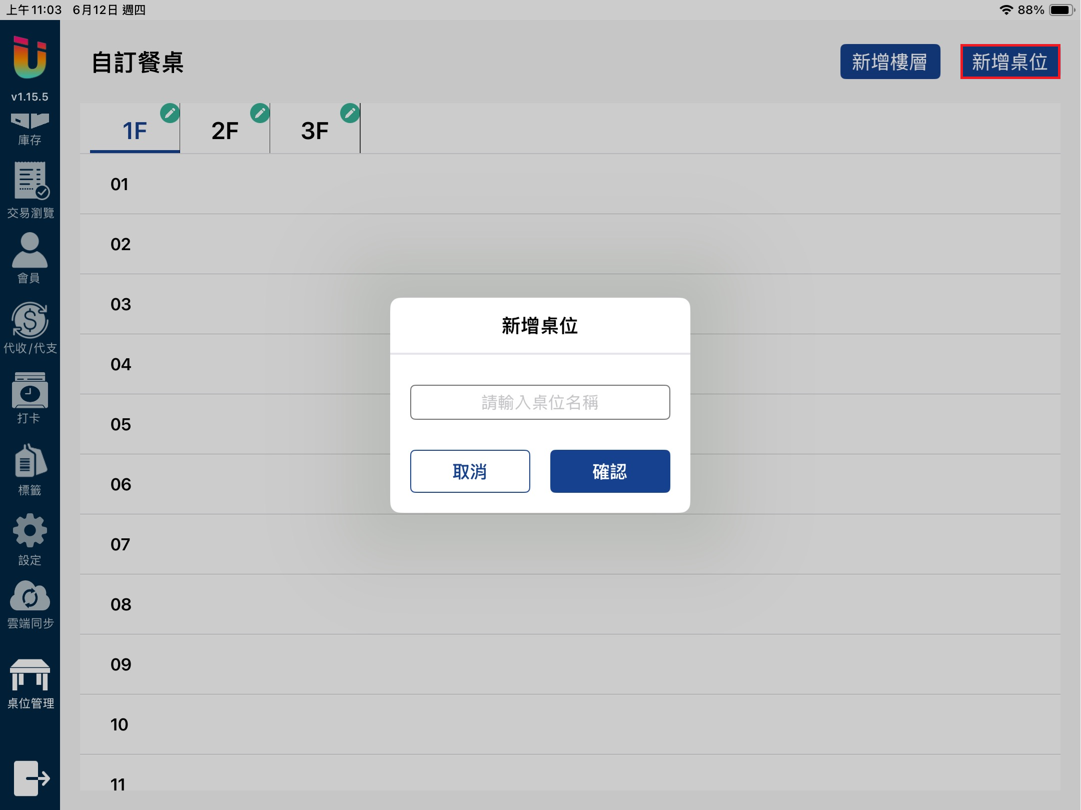 桌位必須按照 [樓層] 進行分層,因此在建立桌位之前必須先建立 [樓層]。