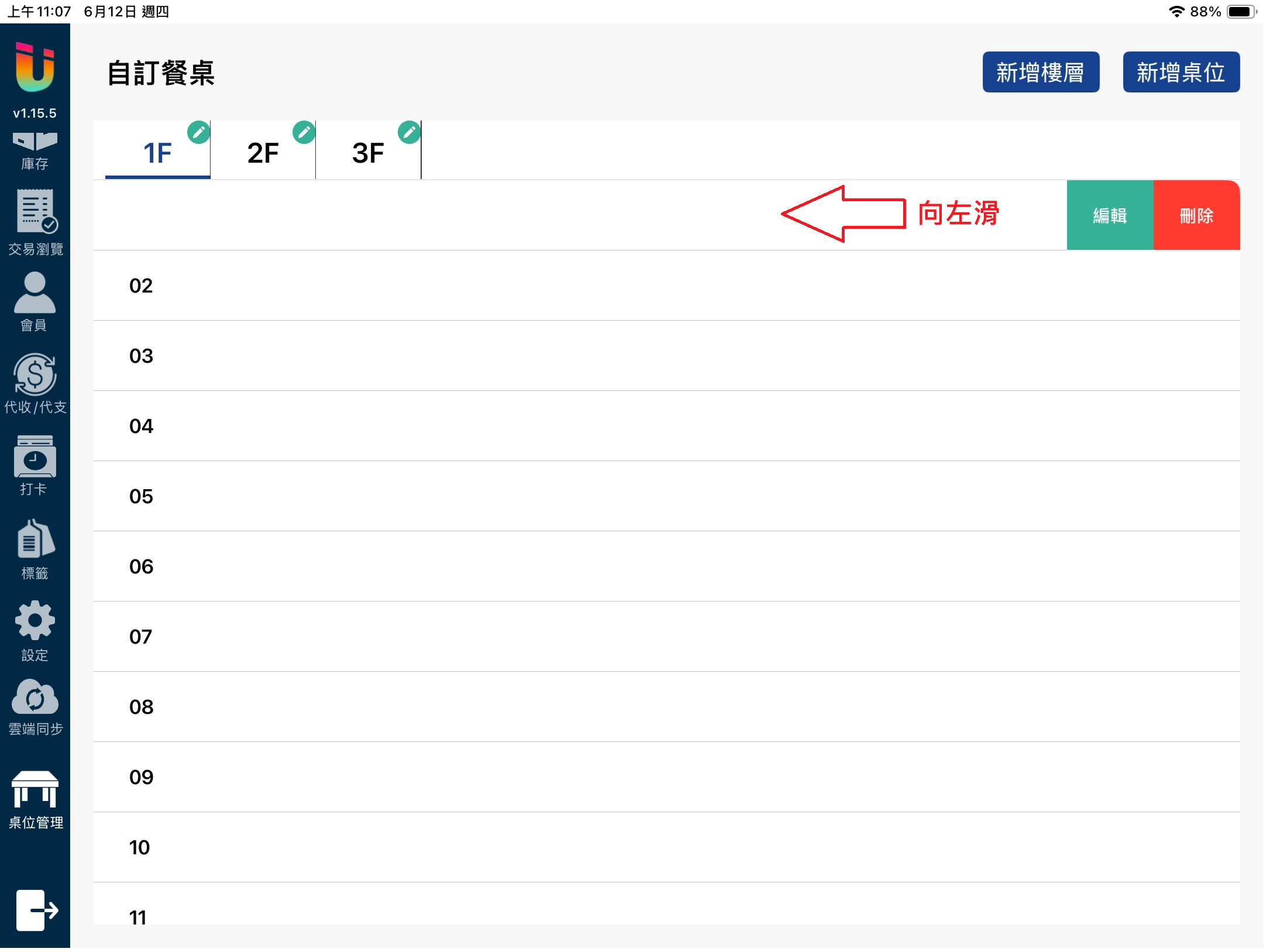 於 [桌位管理] 介面選擇欲編輯的桌位,向左滑即可選擇 [編輯] 或 [刪除] 該桌位。