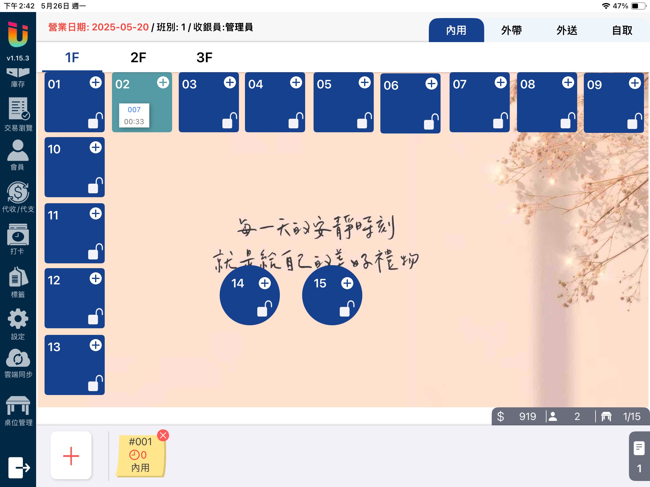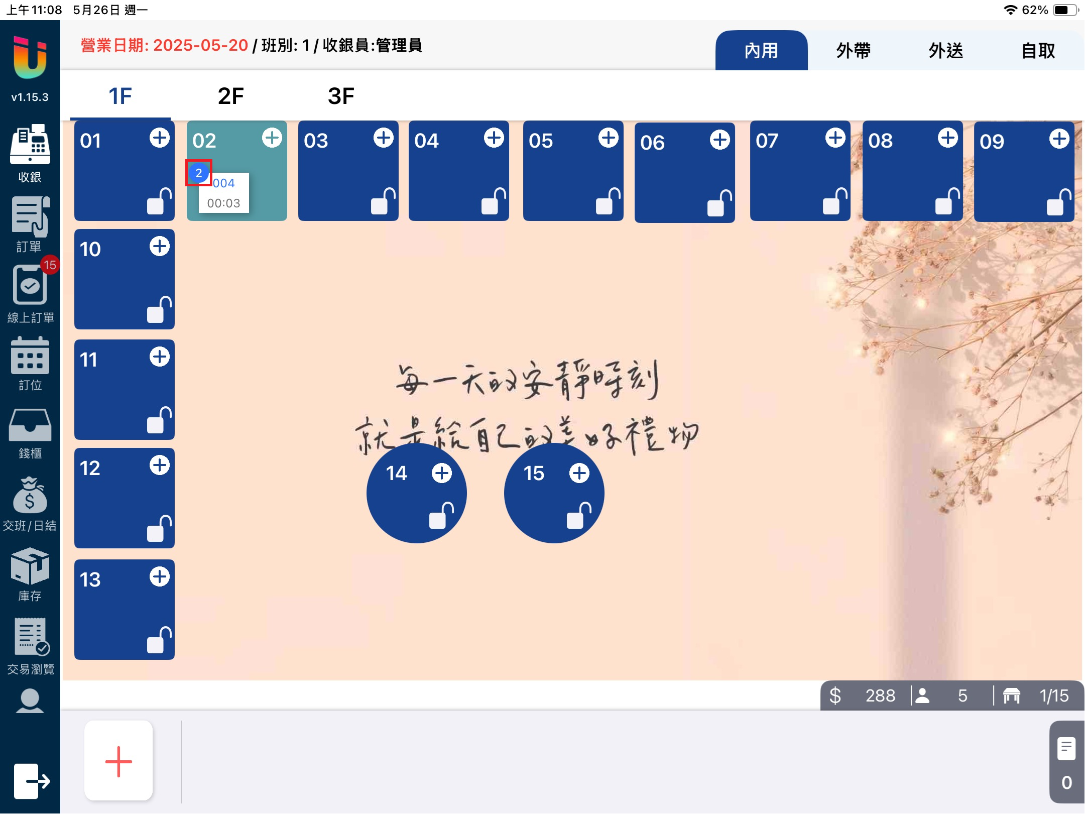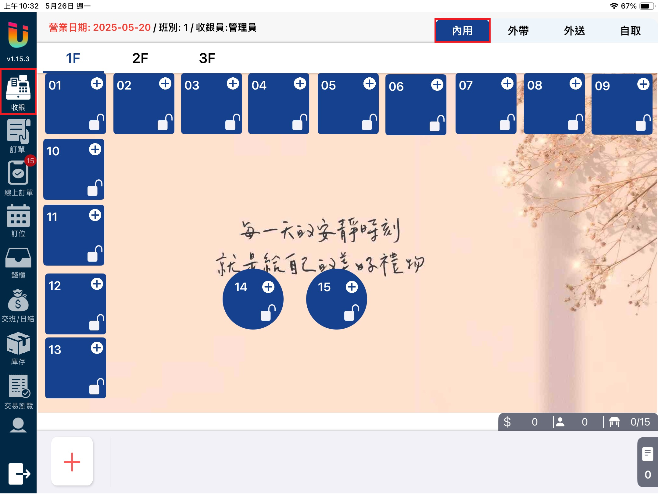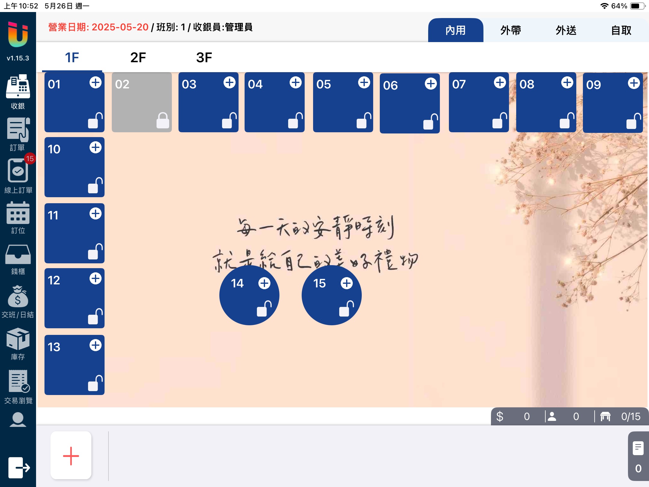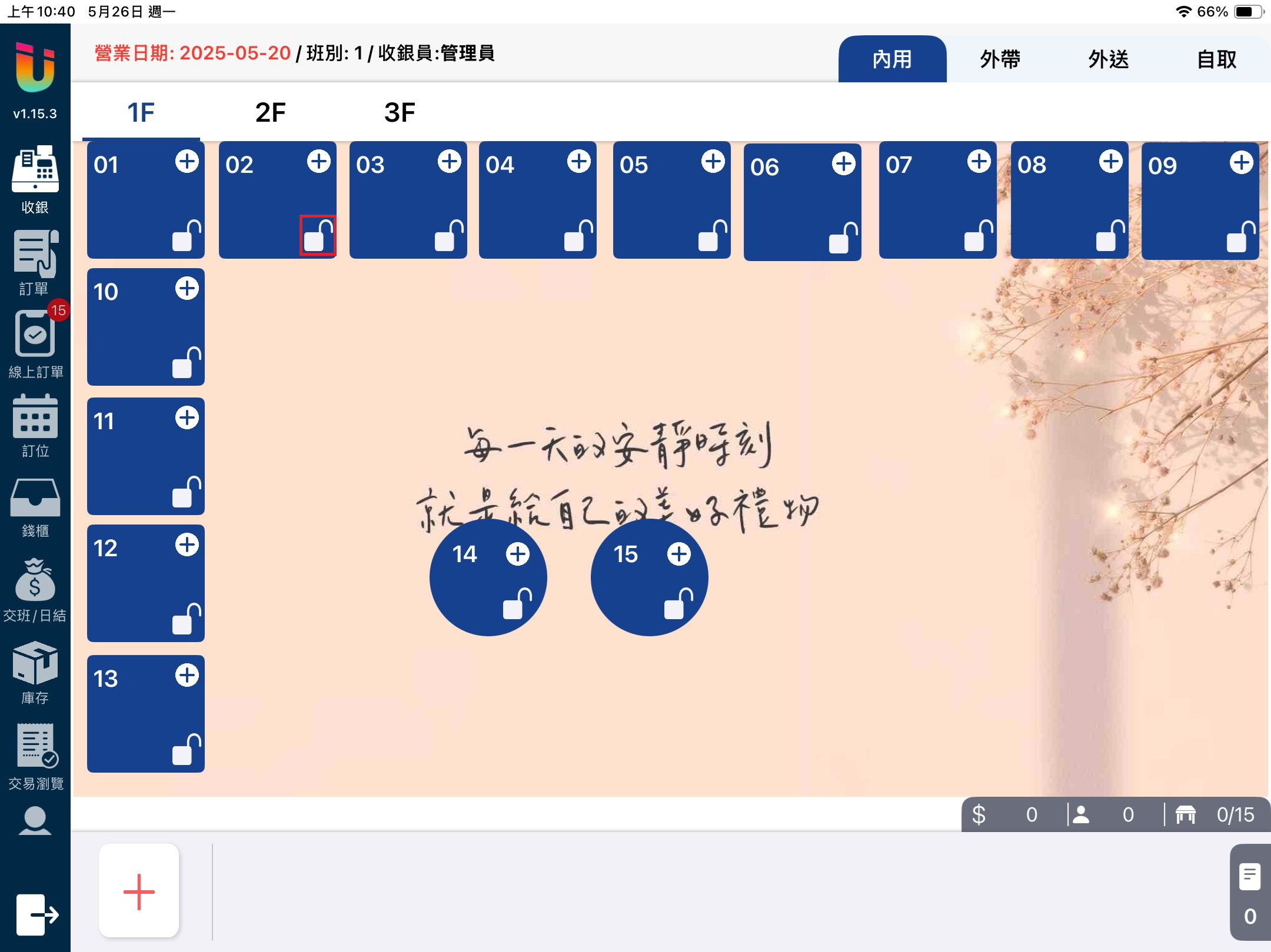 如桌位因整理中或是特殊情況而暫時無法使用,可點擊桌位右下角的 [上鎖] 按鈕將桌位鎖住使其無法使用。