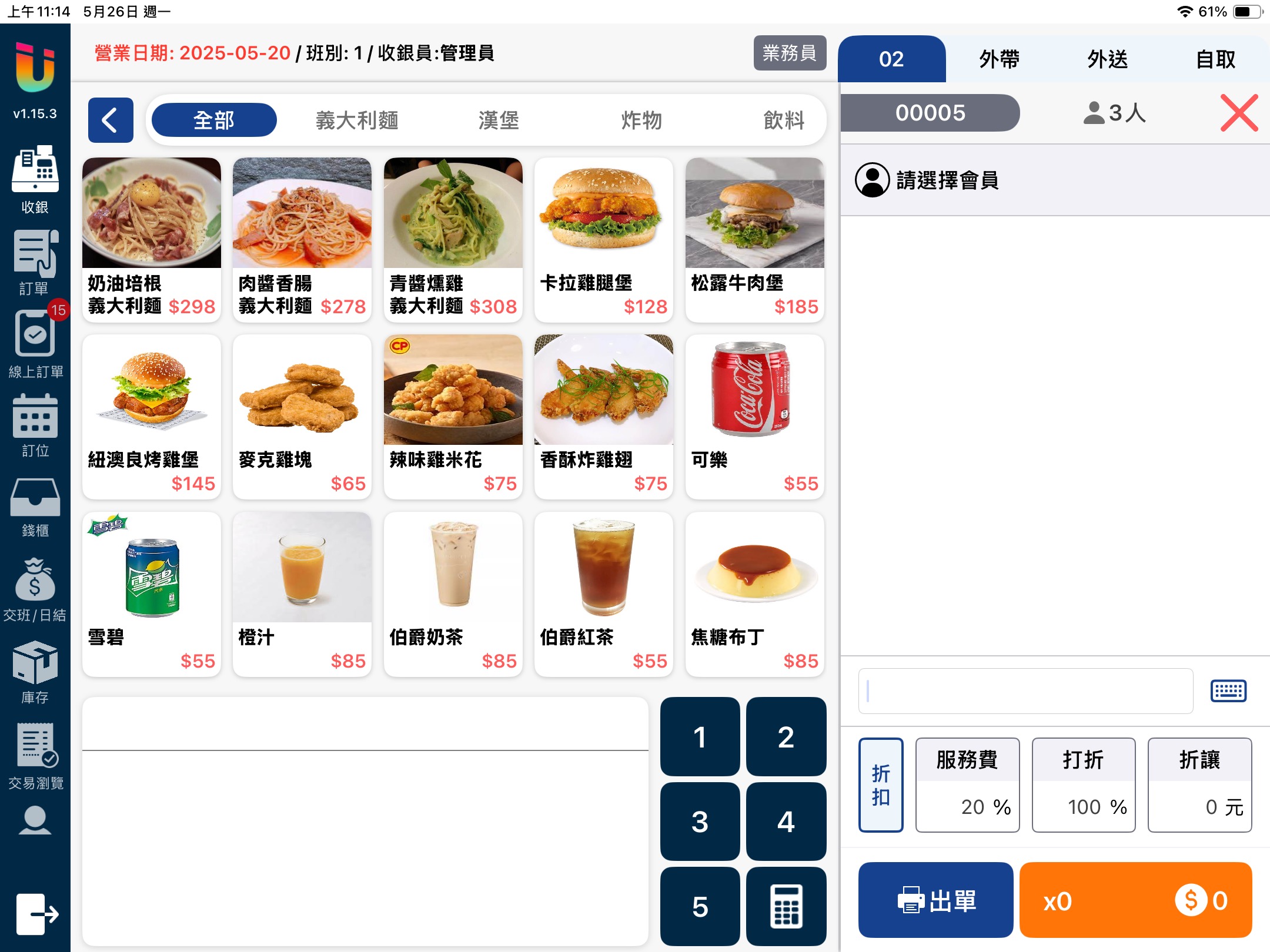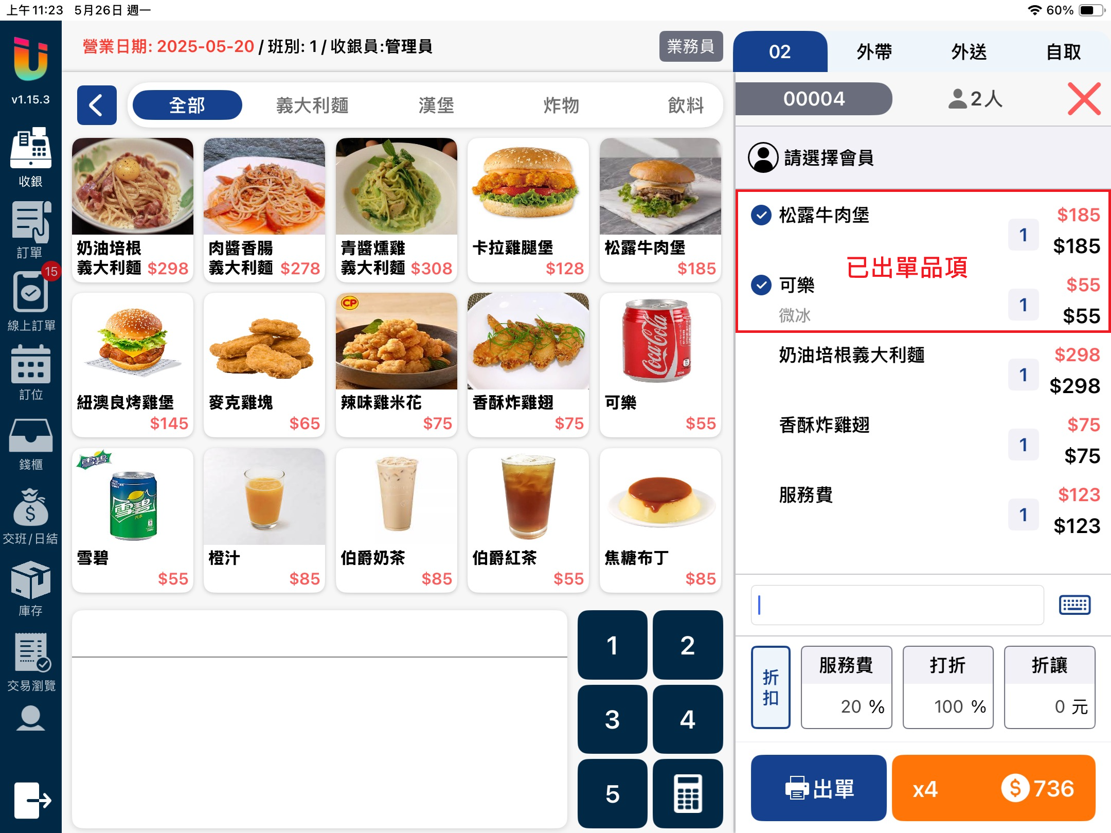 點完餐後點擊 [出單] 按鈕即可列印 [廚房單] 等單據完成點餐。
