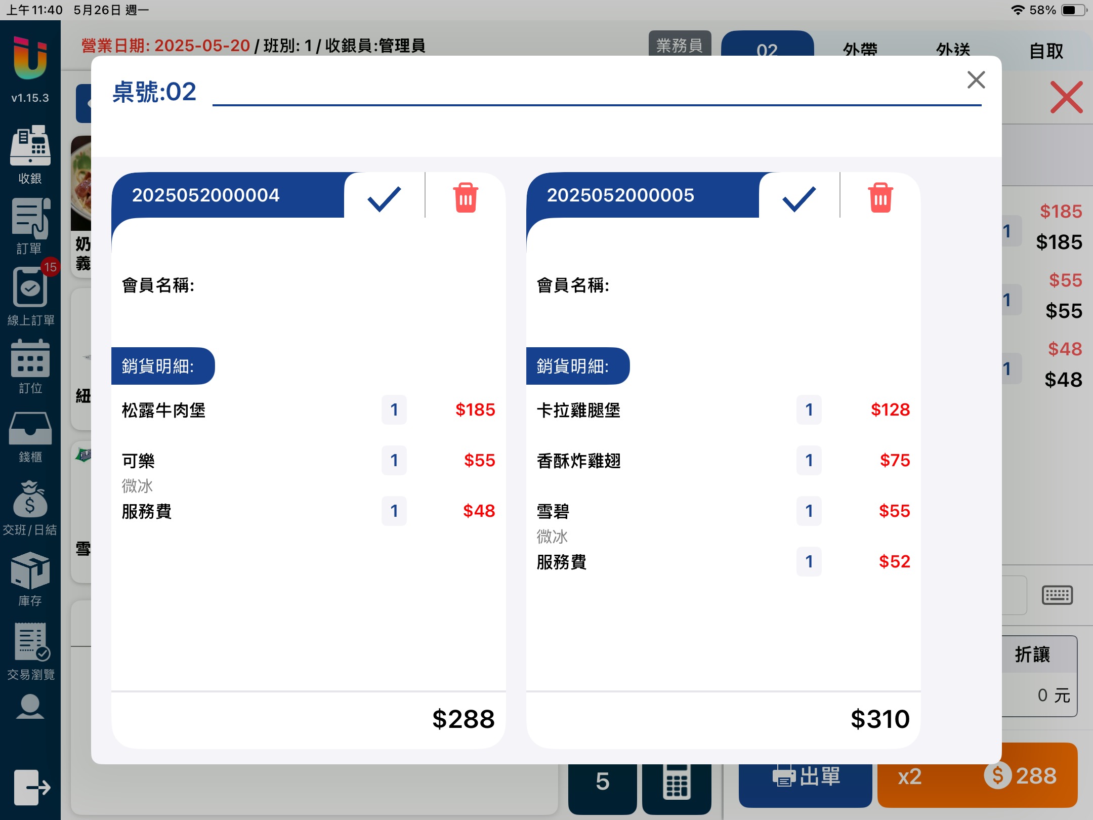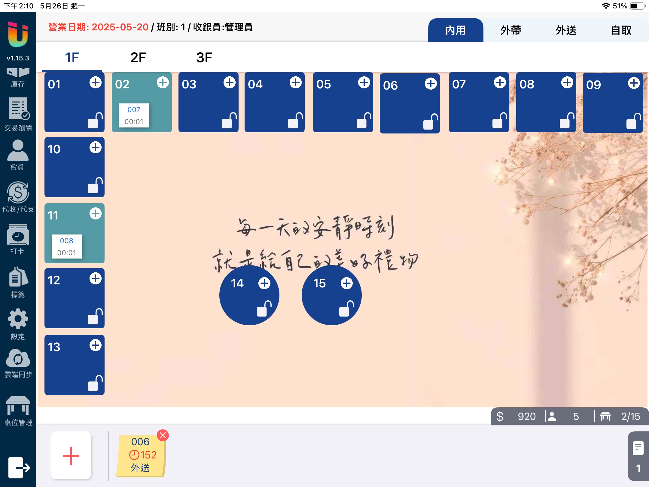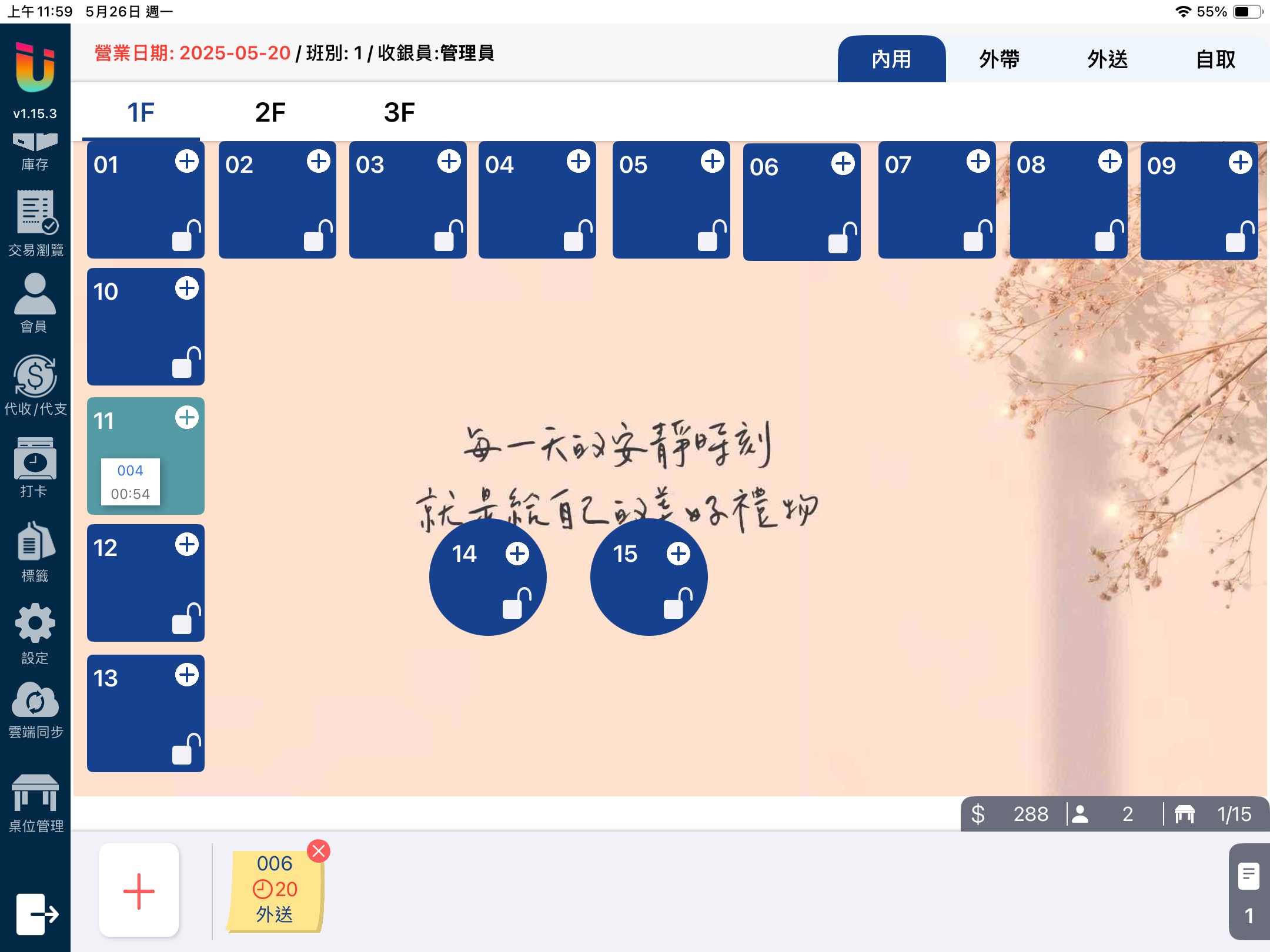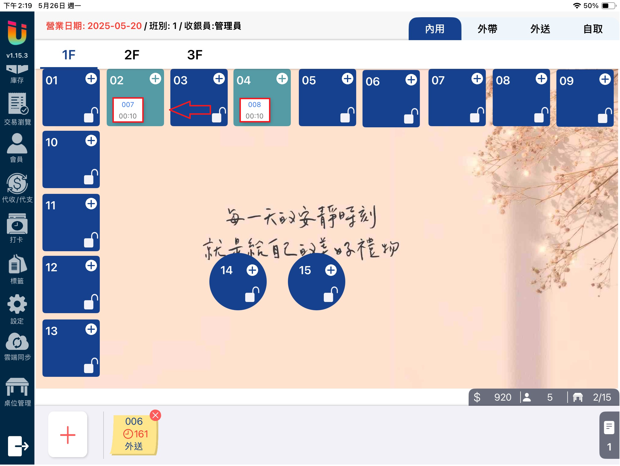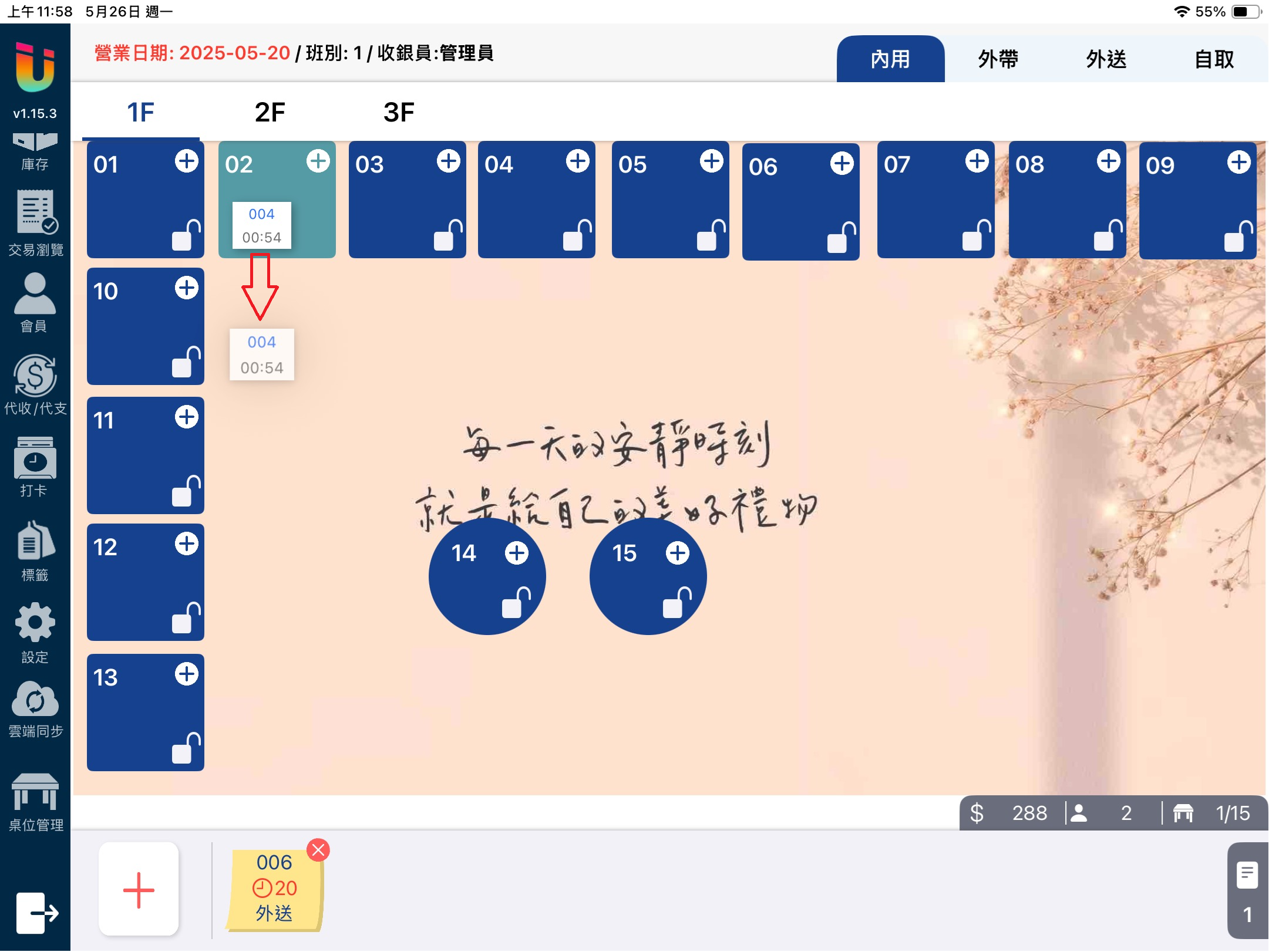 - [外帶]、[外送]、[自取] 的未結單也會顯示於 [預備單]欄位內,並且可用同樣的方式 [長按拖移] 換桌轉為內用單。