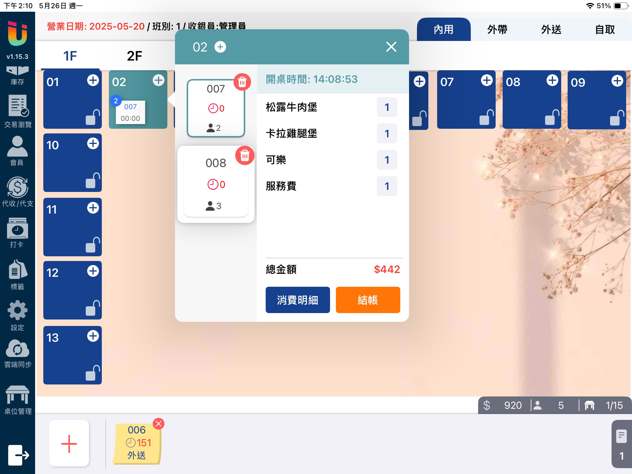 [長按] 桌位可以顯示該桌所有單據的詳細資訊並選擇單據執行操作。