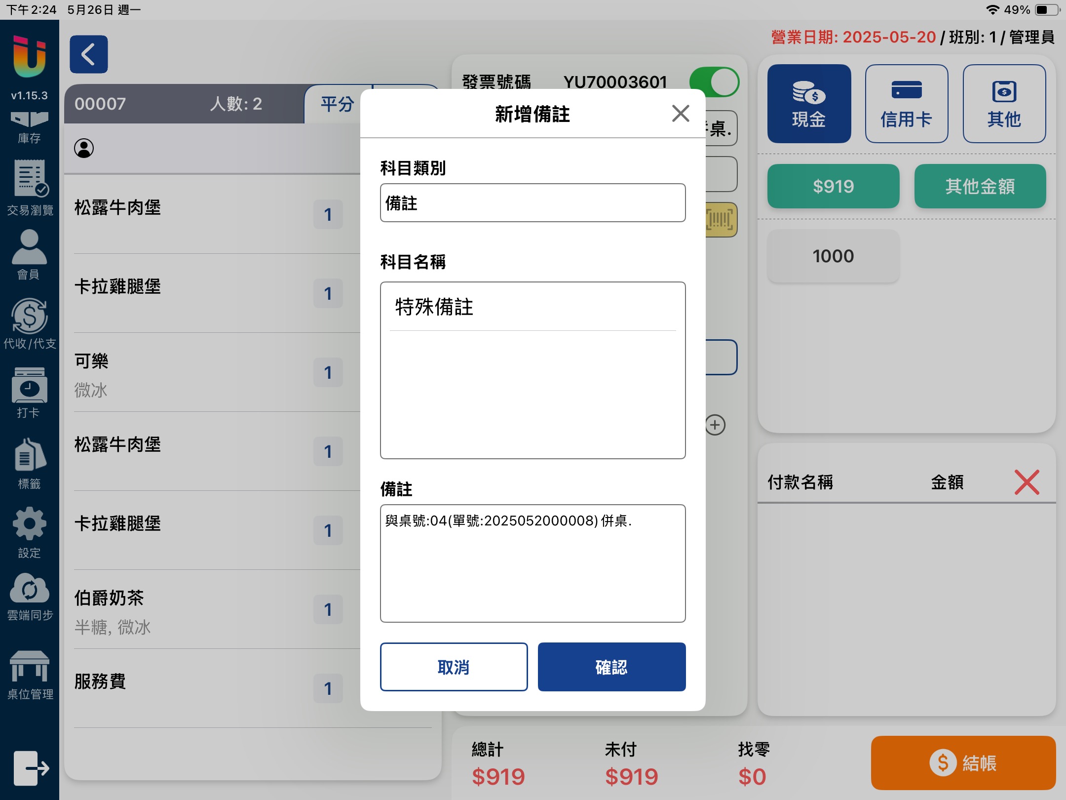 若需要進行 [併桌] 消化客流量,也可於同一桌位開立多張單據。