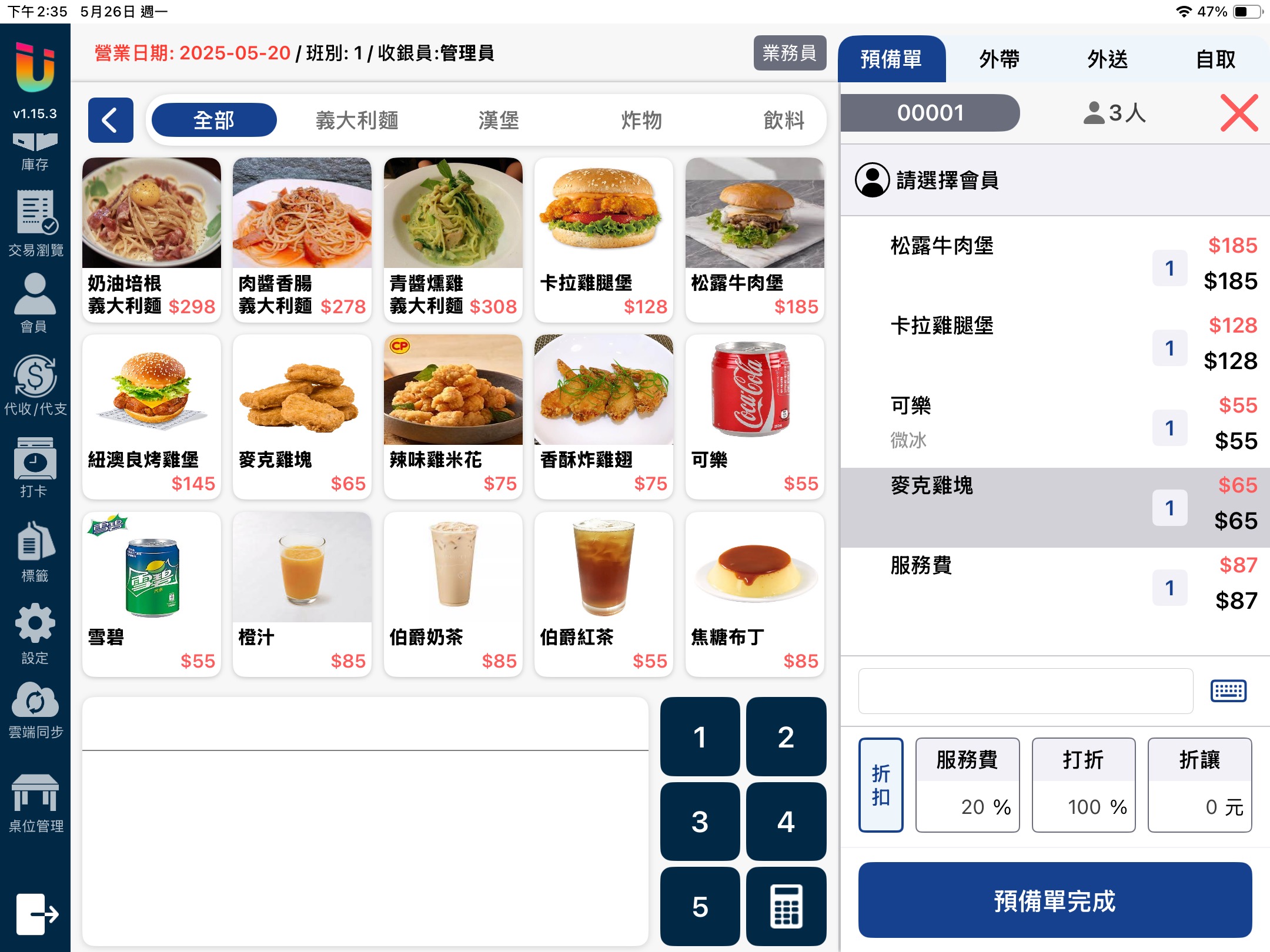 如客流量大可使用 [預備單] 功能幫客人提前點餐,待有空桌客人入座後再將 [預備單] 換桌至客人的桌位以節省點餐時間。