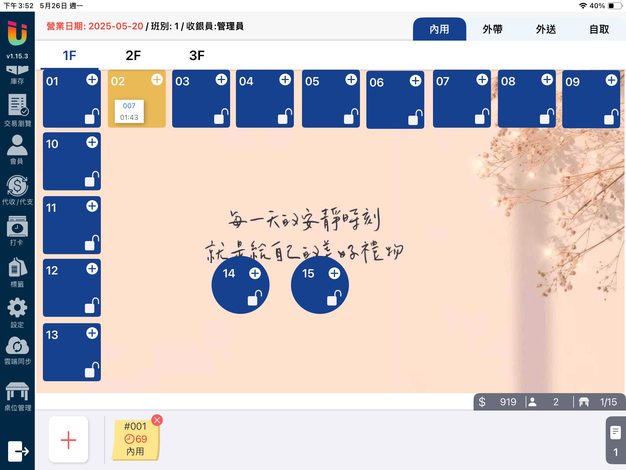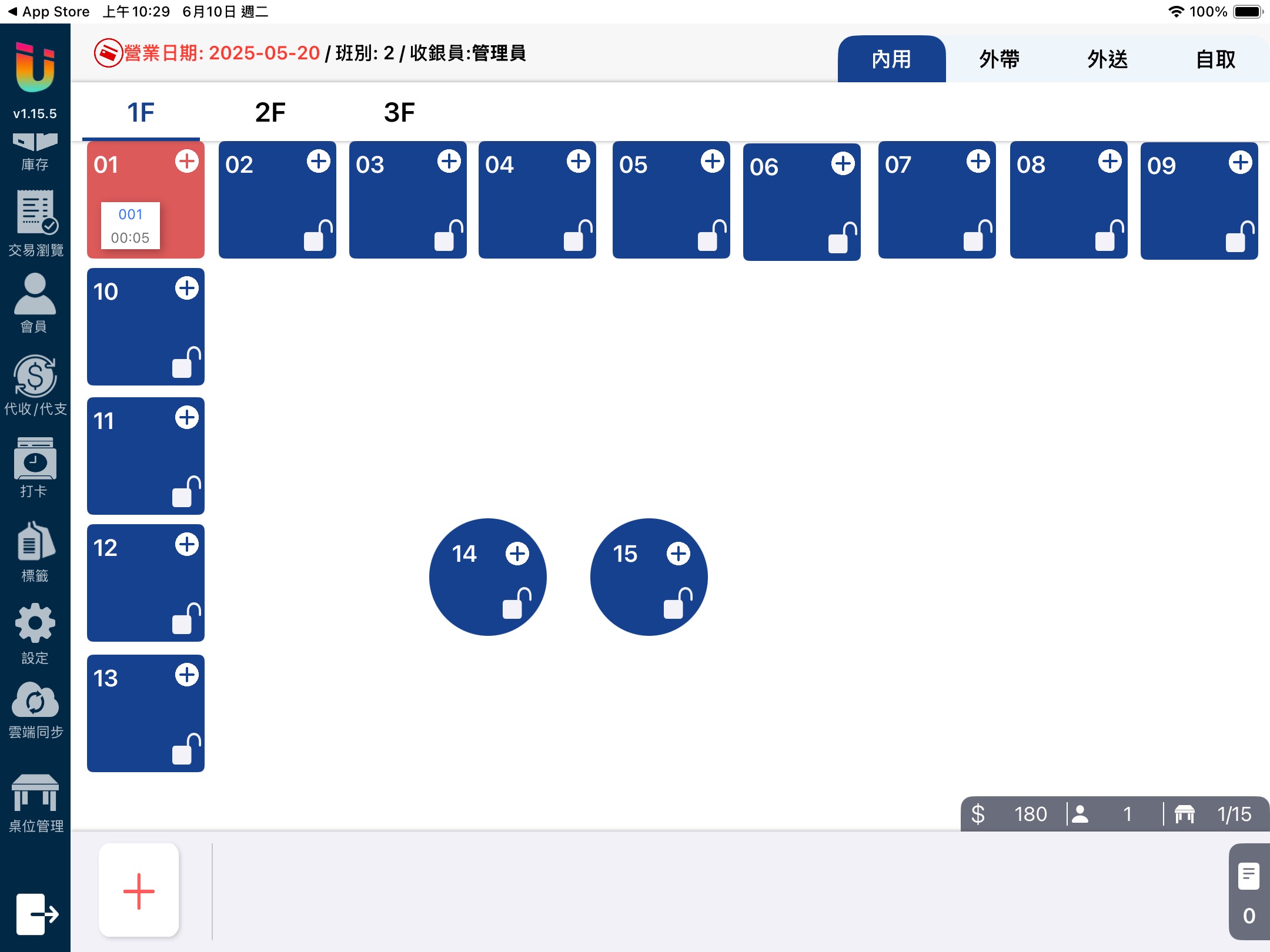 Ushow 可以設定在內用單據結帳完後自動將桌位 [鎖桌],適用於需要進行清潔,待完成才開放餐桌給下一組使用的情境。