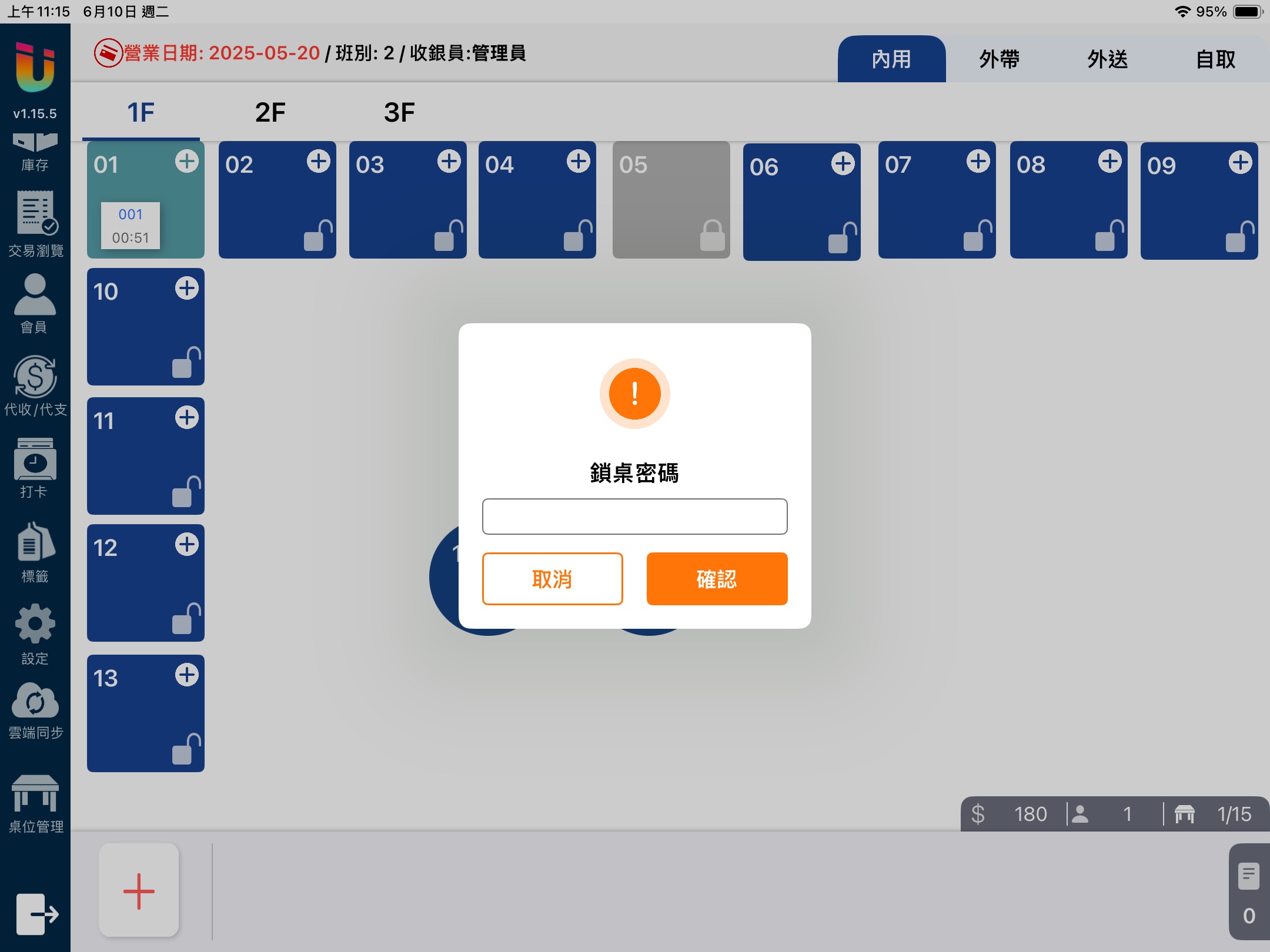 [桌位系統] 可以設定在解除 [鎖桌] 時要輸入密碼才能解鎖,以確保不會誤解鎖。