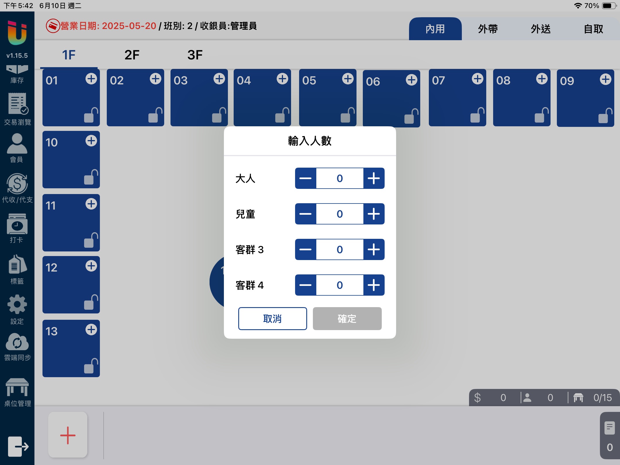 若需要完整 [來客數] 的紀錄,可開啟內用單據在 [開桌] 時皆需要輸入 [來客數] 的功能。