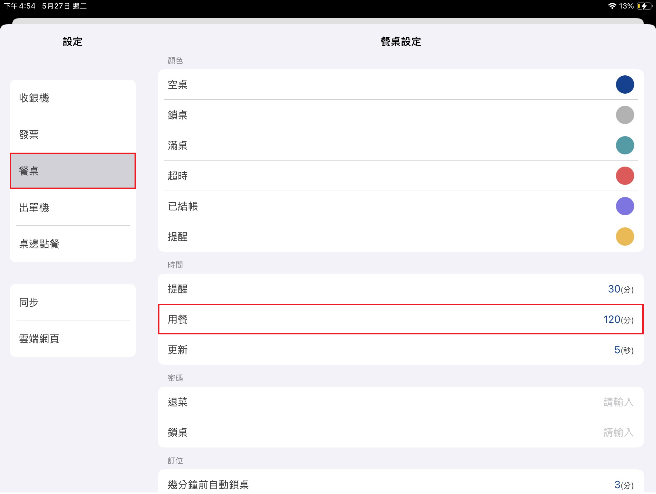 當剩餘用餐時間低於提醒時間時,桌位會變色成 [提醒] 顏色以做提醒。