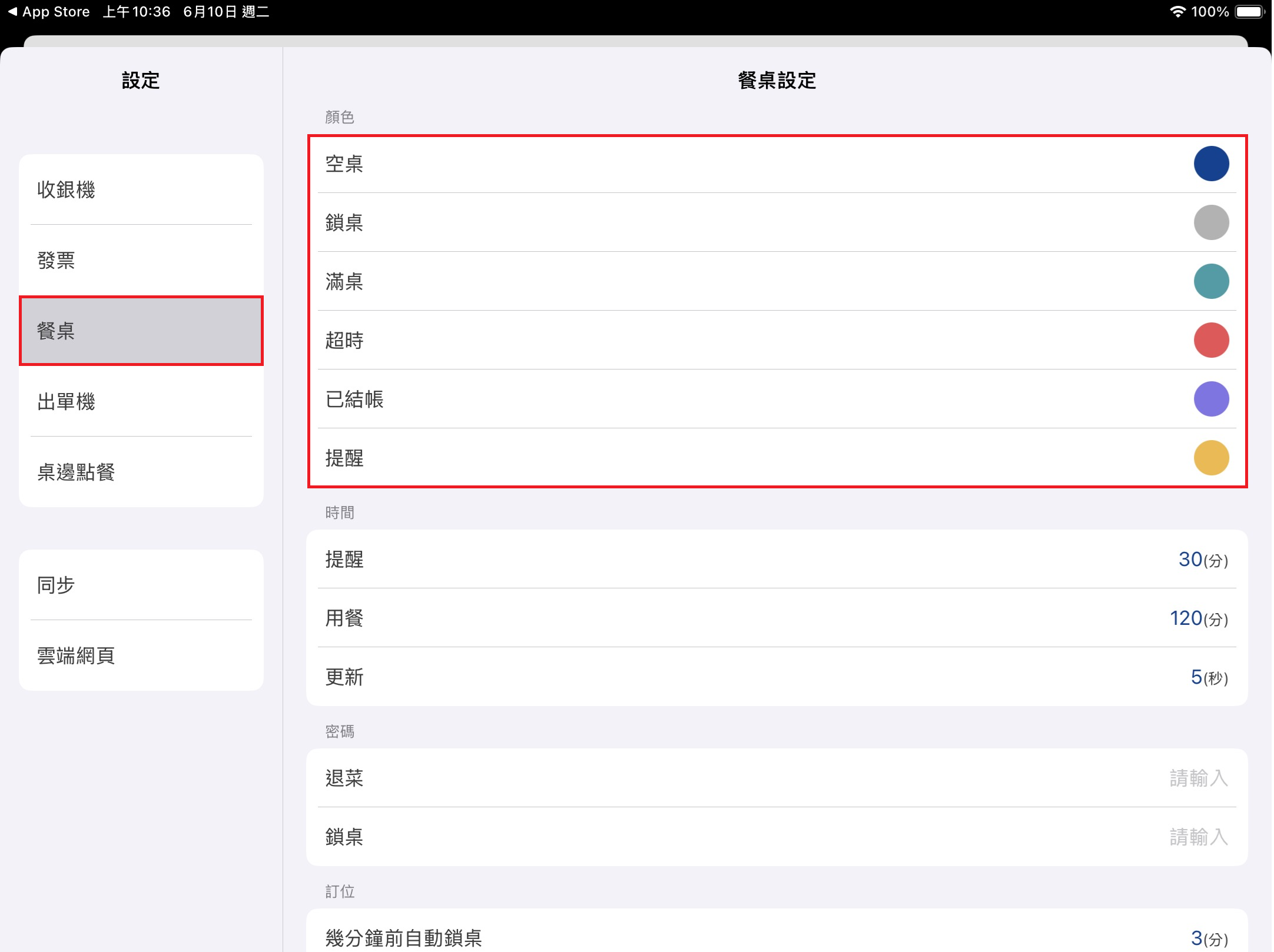 [桌位系統] 的桌位狀態主要以顏色做區分,於左方 [功能表] 點選 [設定],點擊該頁面 [餐桌] > [顏色] 可調整不同顏色所代表的 [桌位狀態]。