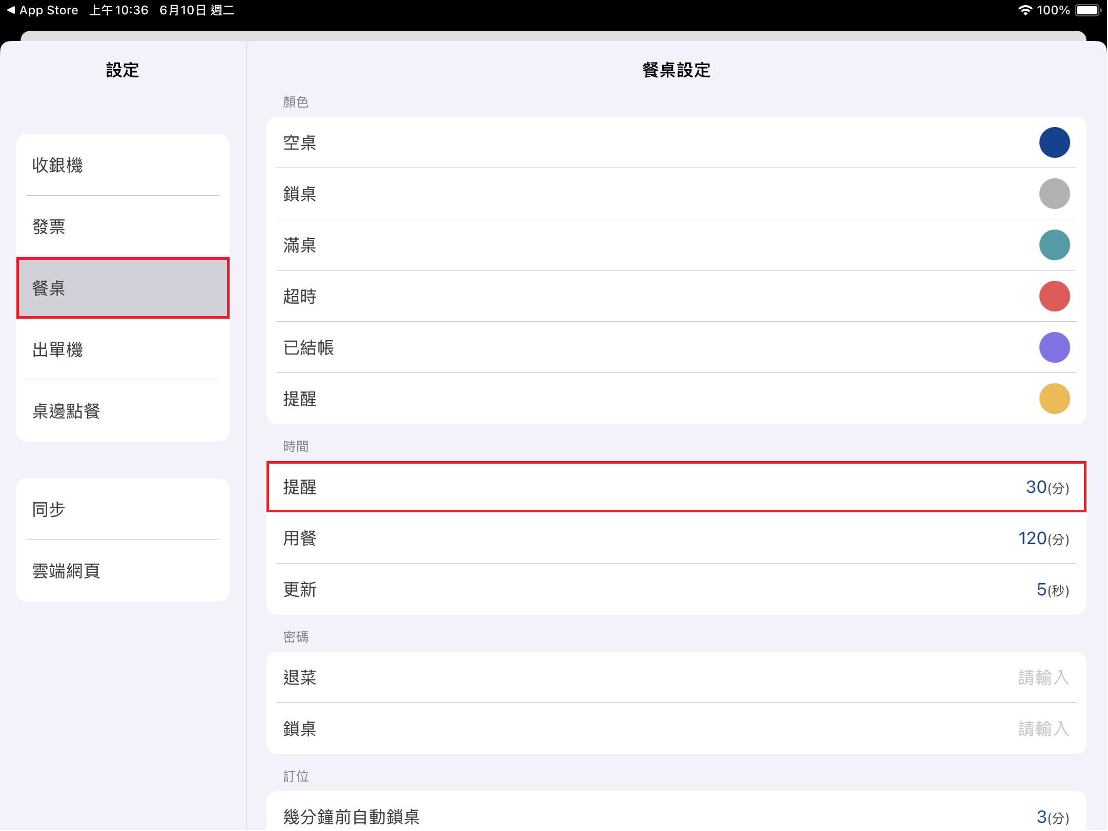 於左方 [功能表] 點選 [設定],點擊該頁面 [餐桌] > [時間] > [提醒] 即可設定內用 [提醒時間]。