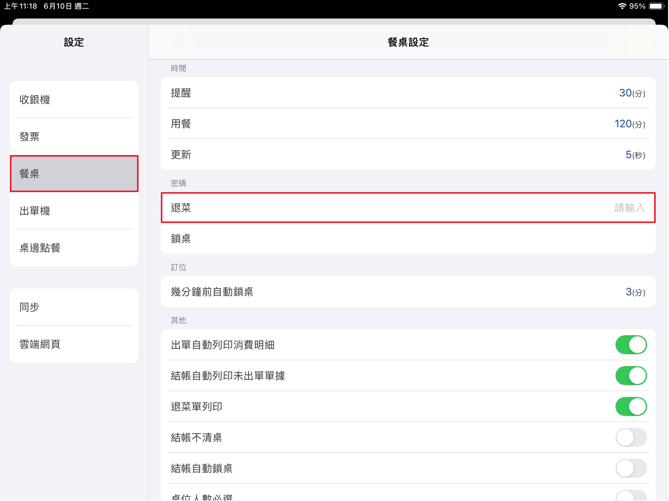 於左方 [功能表] 點選 [設定],點擊該頁面 [餐桌] > [密碼] > [退菜] 設定 [退菜] 時所需輸入的密碼,若留空則不需輸入密碼即可退菜。