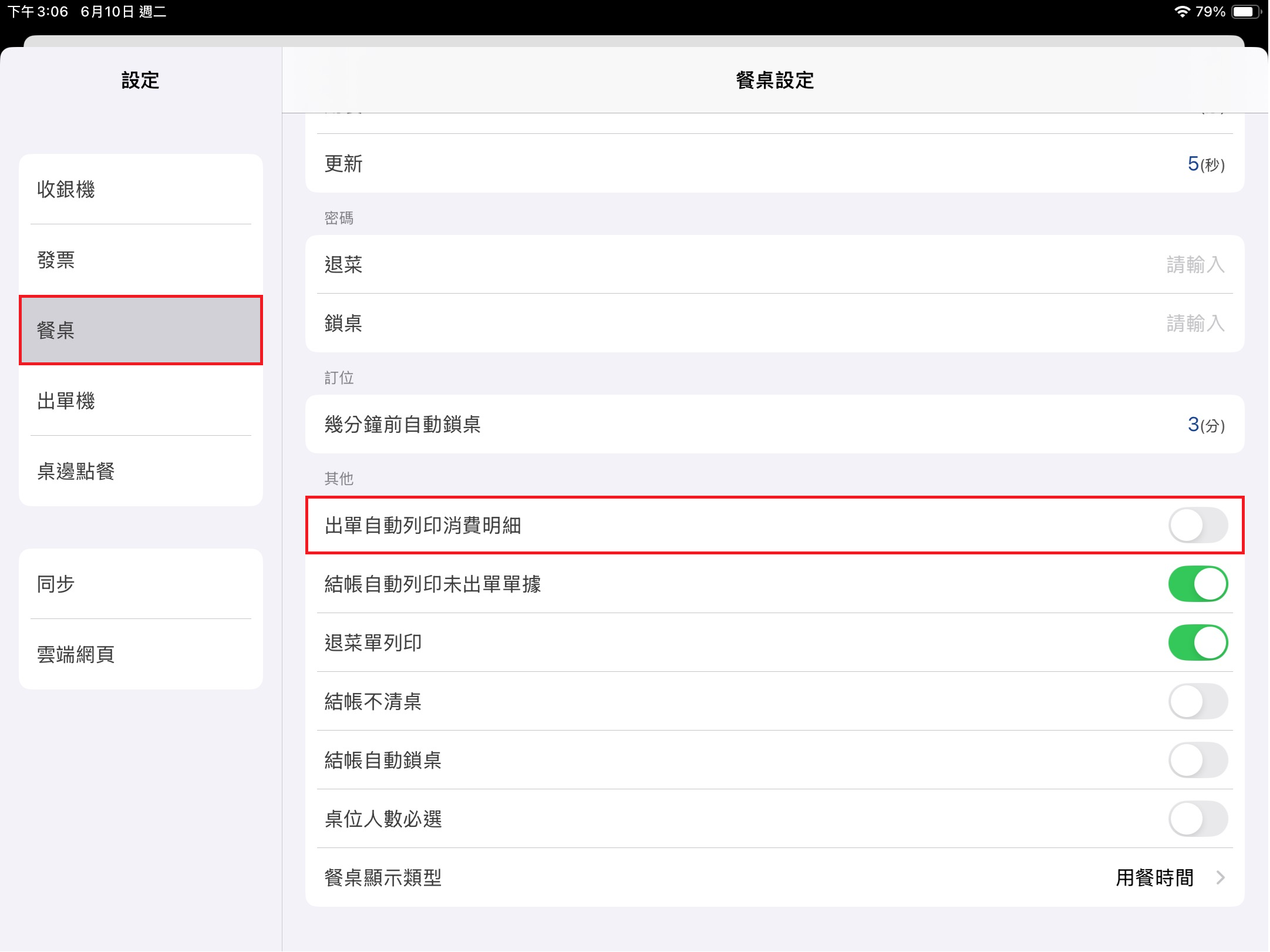 於左方 [功能表] 點選 [設定],點擊該頁面 [餐桌] > [其他] > [出單自動列印消費明細]。