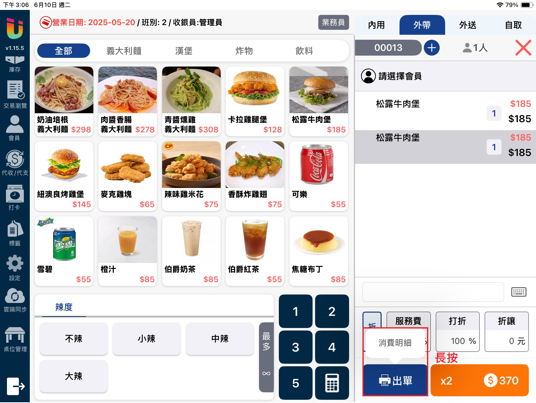 開關可以調整出單時是否列印 [消費明細單],若關閉時需要列印消費明細單,長按 [出單] 按鈕並點擊 [消費明細] 即可進行手動列印。