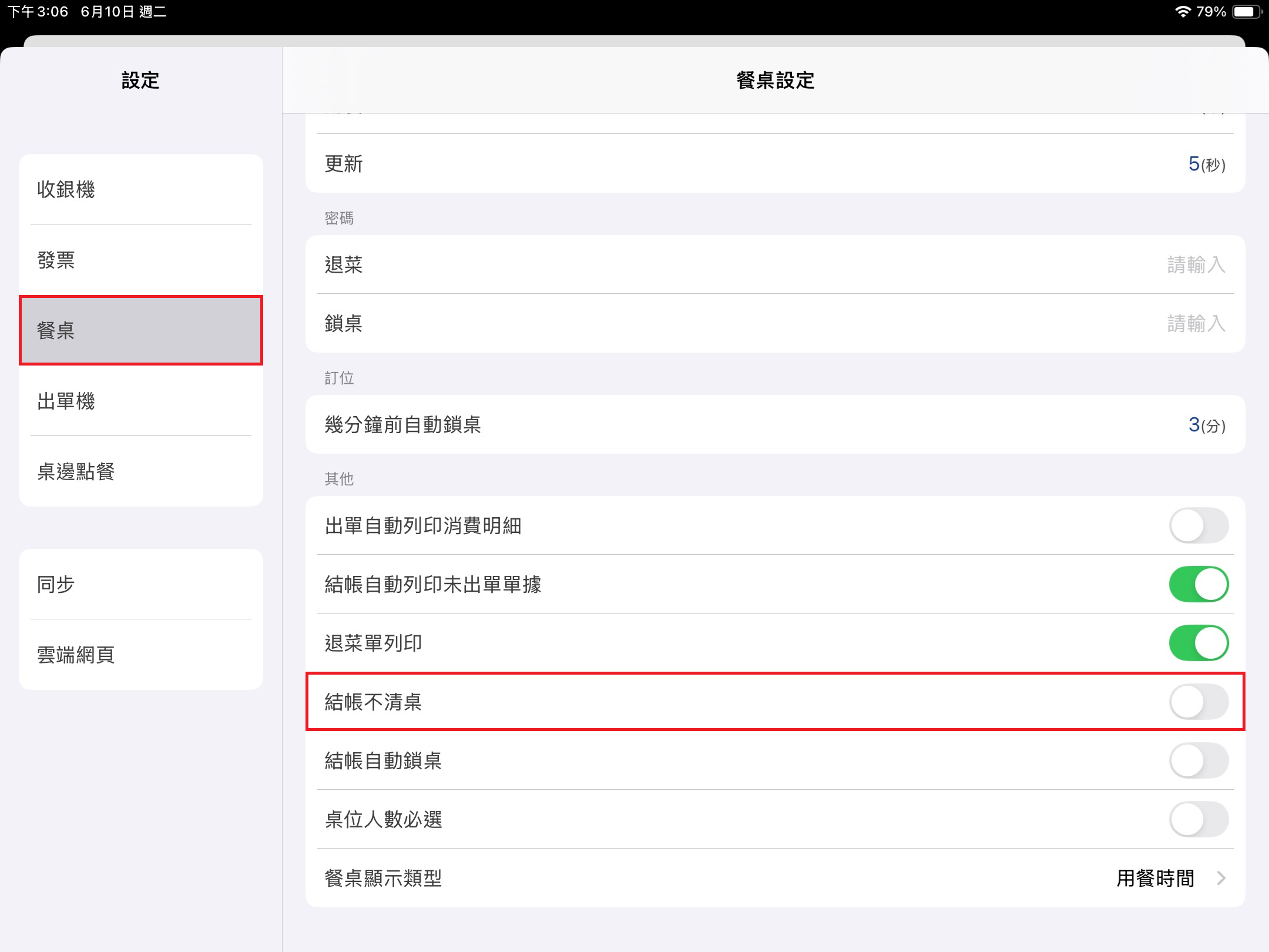 於左方 [功能表] 點選 [設定],點擊該頁面 [餐桌] > [其他] > [結帳不清桌] 。