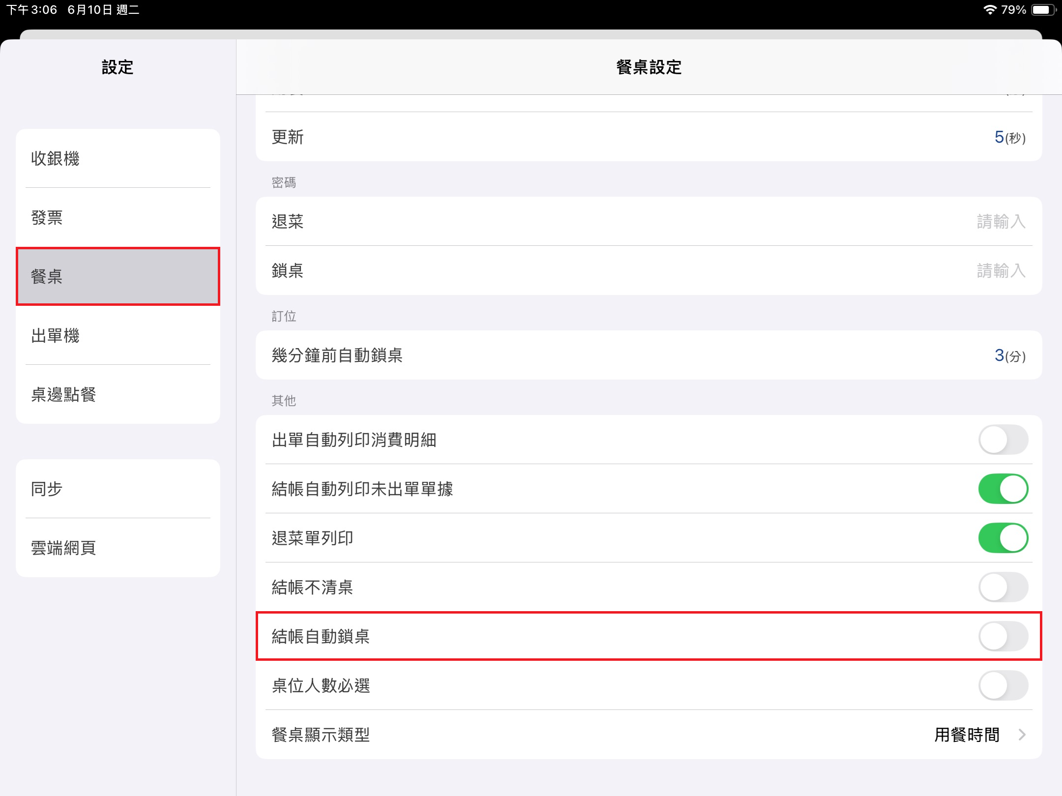 於左方 [功能表] 點選 [設定],點擊該頁面 [餐桌] > [其他] > [結帳自動鎖桌],完成動作後再由前台員工點選桌位右下角鎖圖示,解鎖轉為 [空桌] 開放使用。