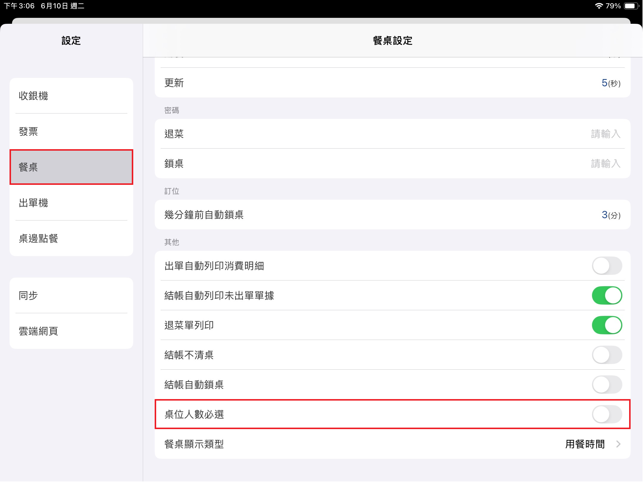 於左方 [功能表] 點選 [設定],點擊該頁面 [餐桌] > [其他] > [桌位人數必選] ,打開此開關則強制要求輸入 [來客數] 才能開桌。