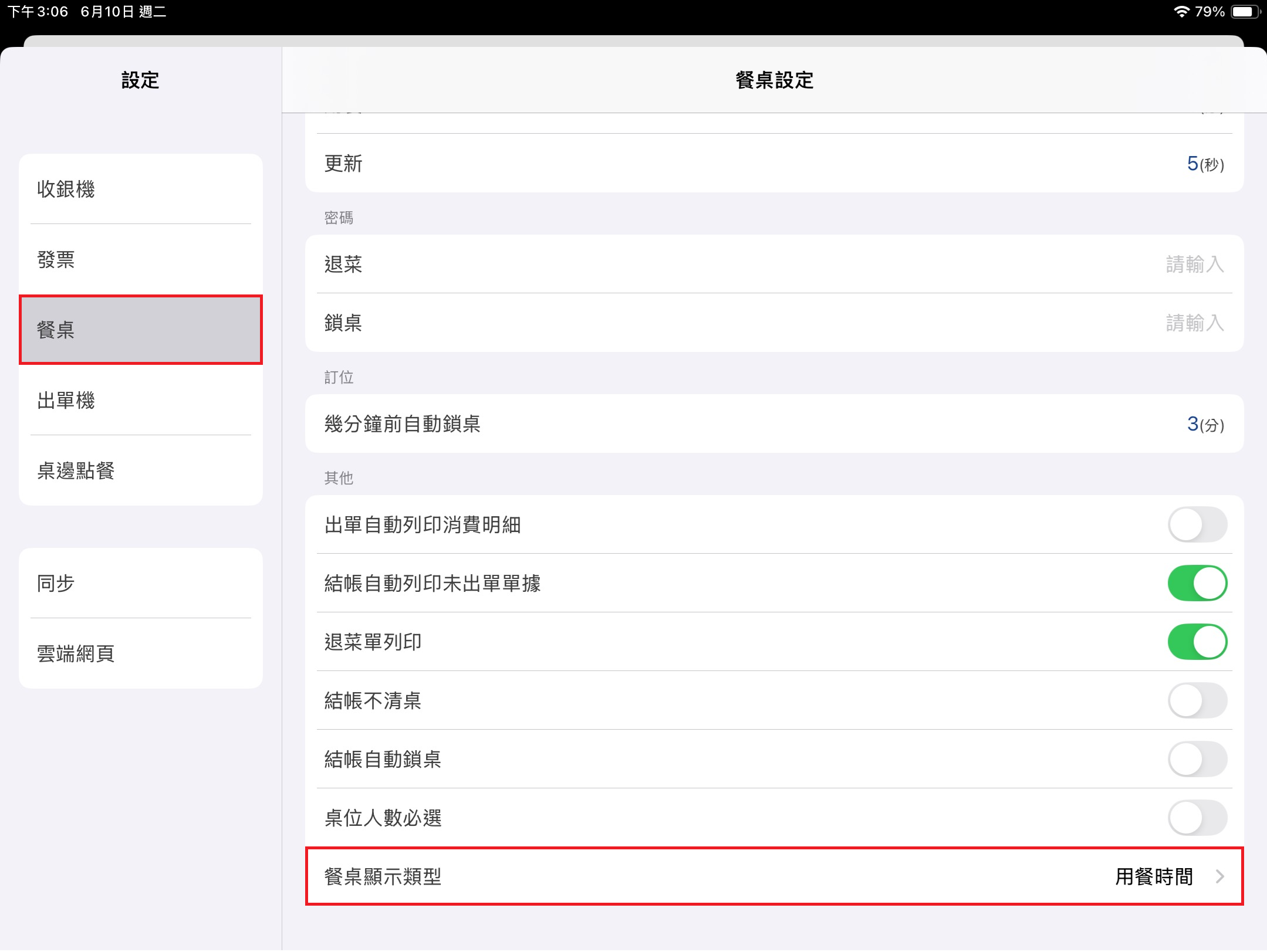 於左方 [功能表] 點選 [設定],點擊該頁面 [餐桌] > [其他] > [餐桌顯示類型] 即可選擇 [總金額] 或 [已用餐時間]。