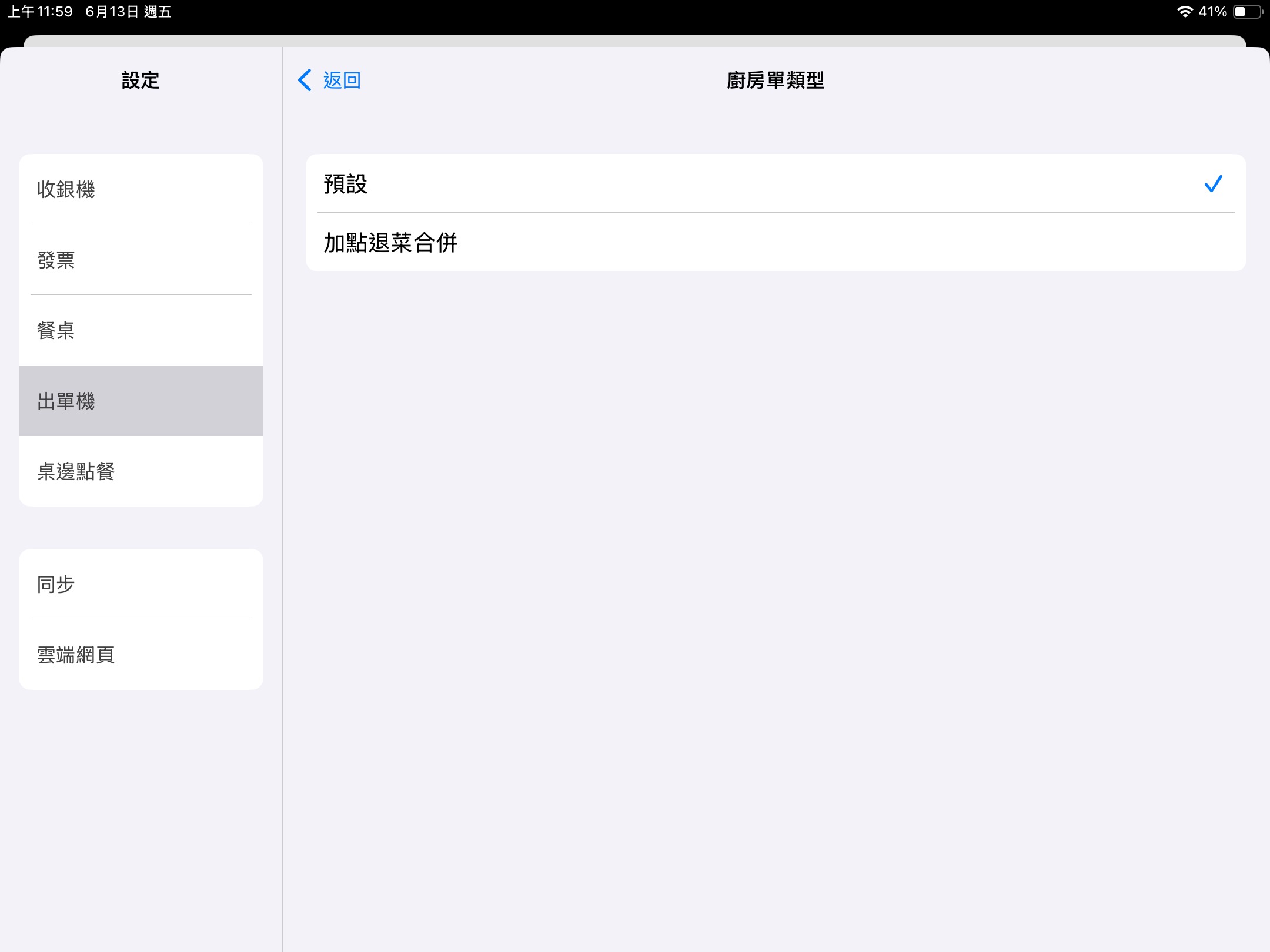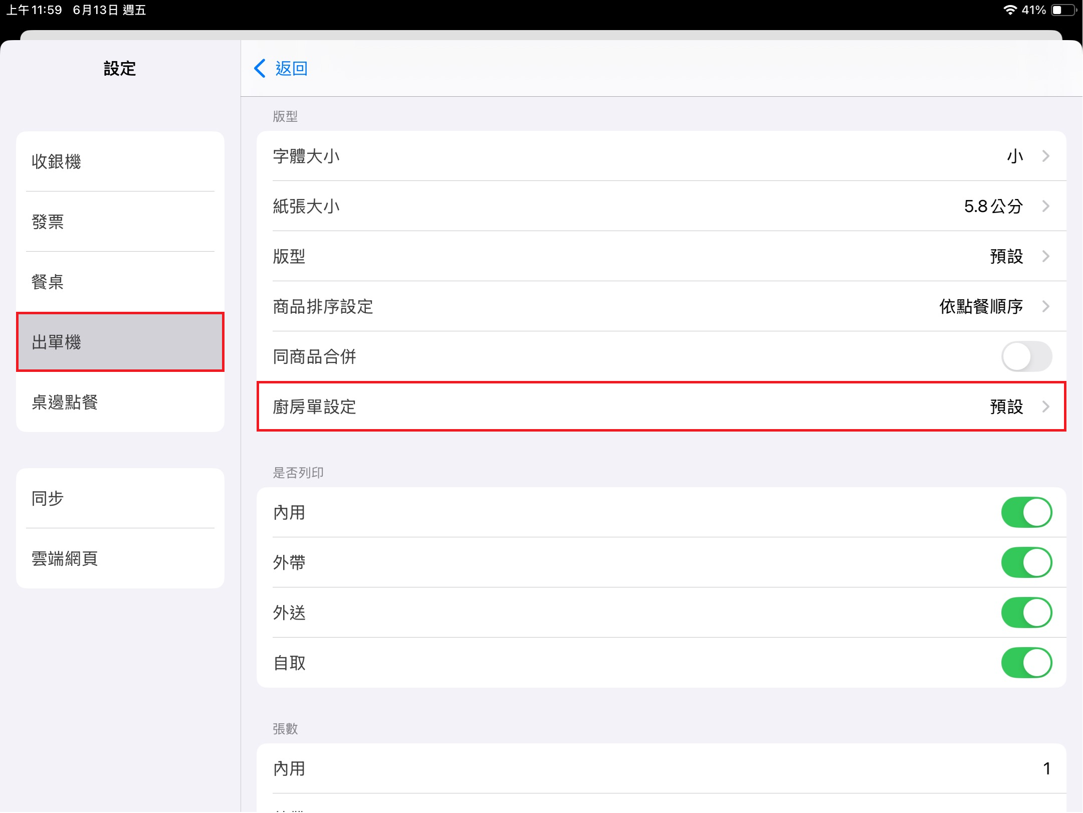 於左方 [功能表] 點選 [設定],點擊左方 [出單機] > [廚房單]或[對菜單] > [版型] > [廚房單設定] ,調整預設或加點退菜合併。