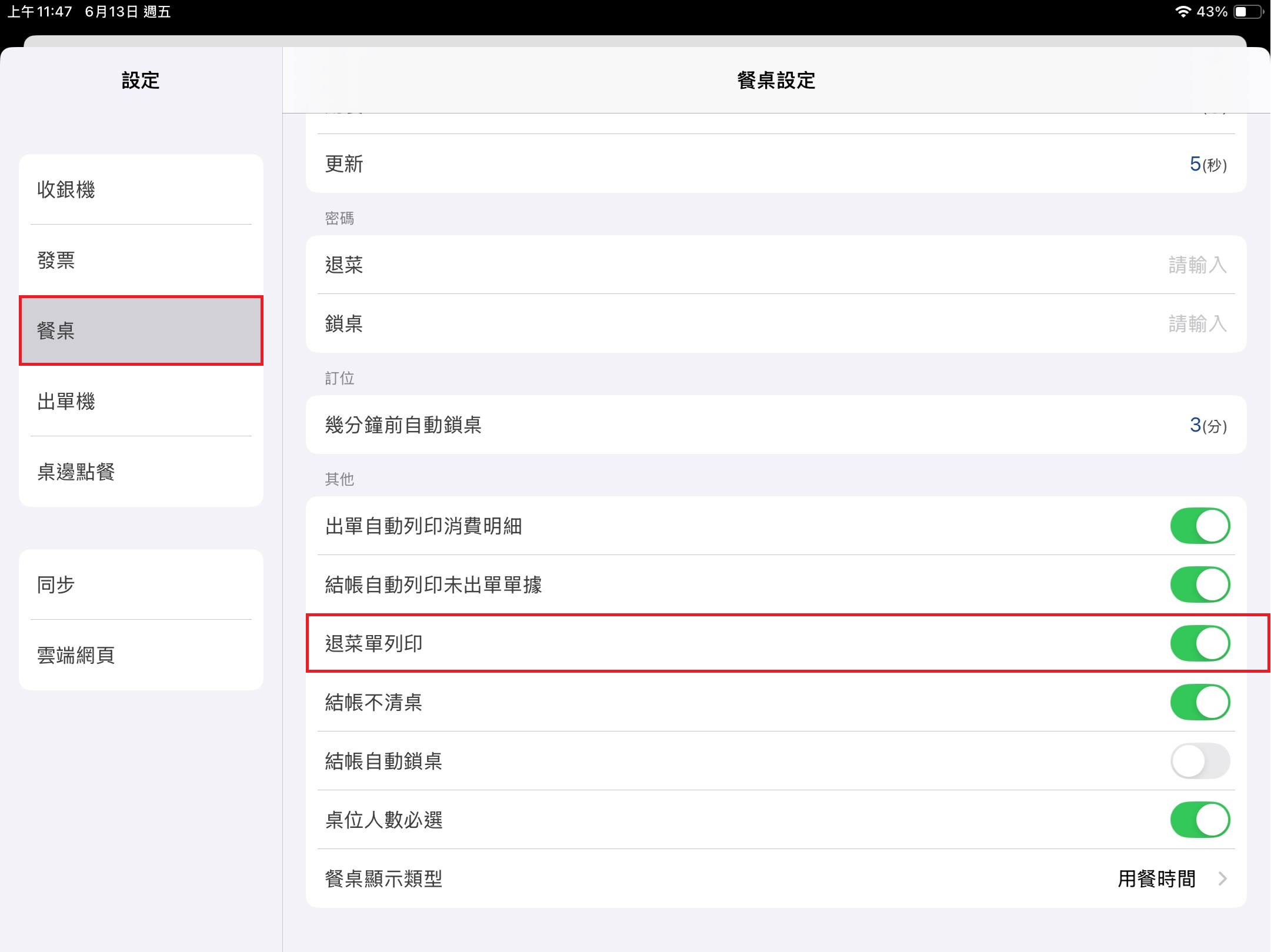 [桌位系統] 可以設定在 [退菜] 時要輸入密碼才能退菜,以確保不會誤退。