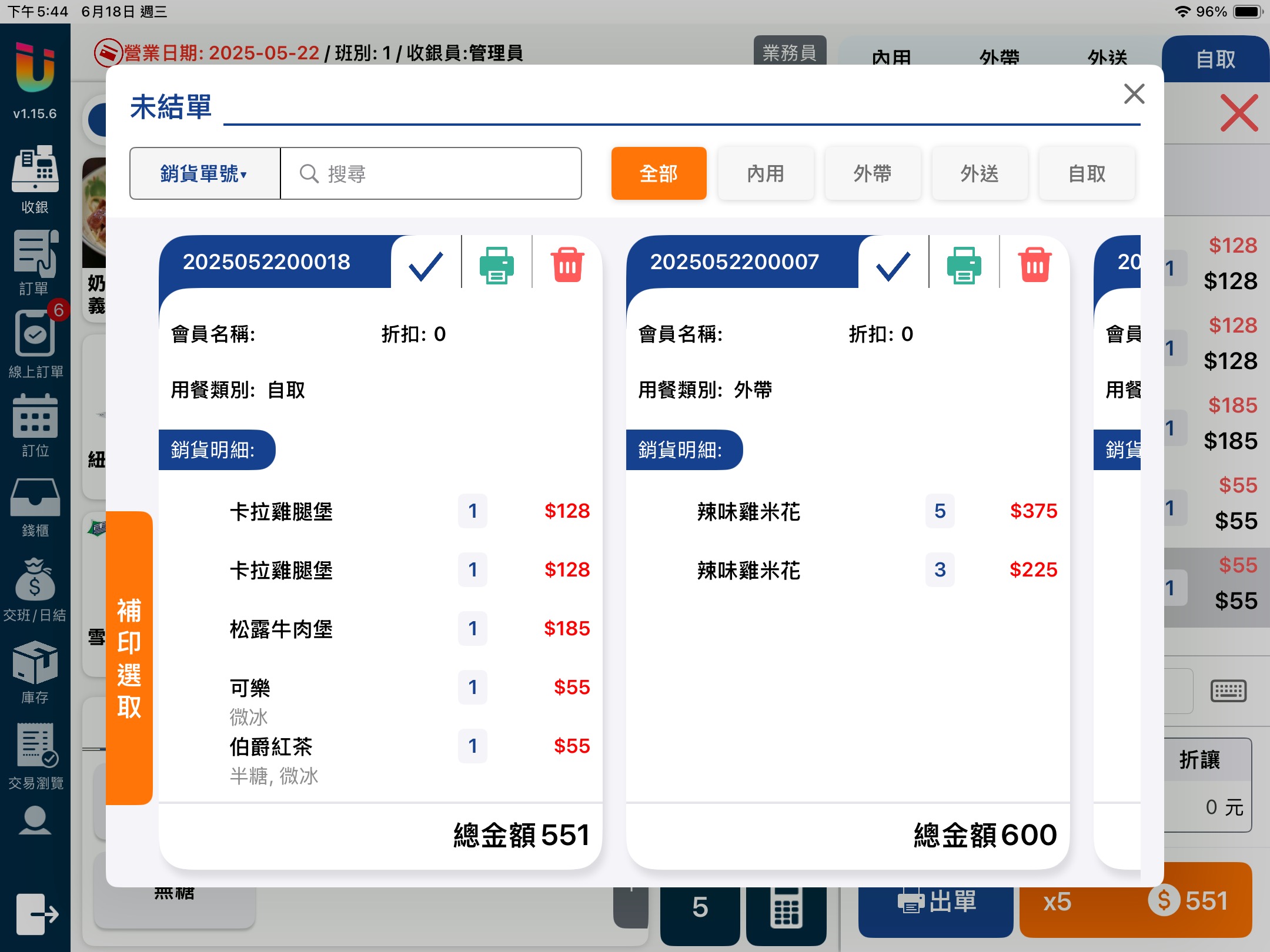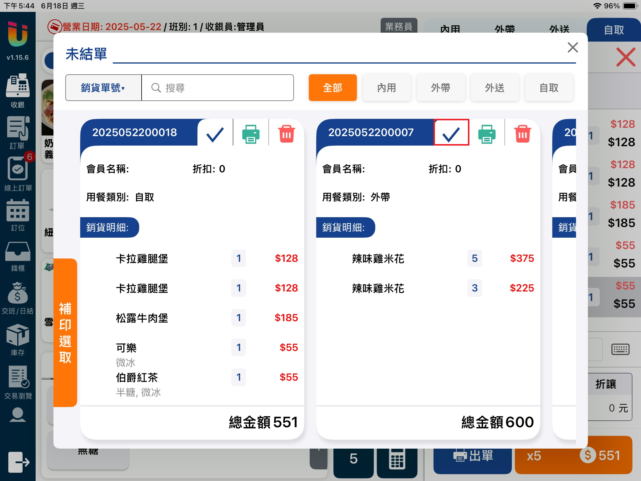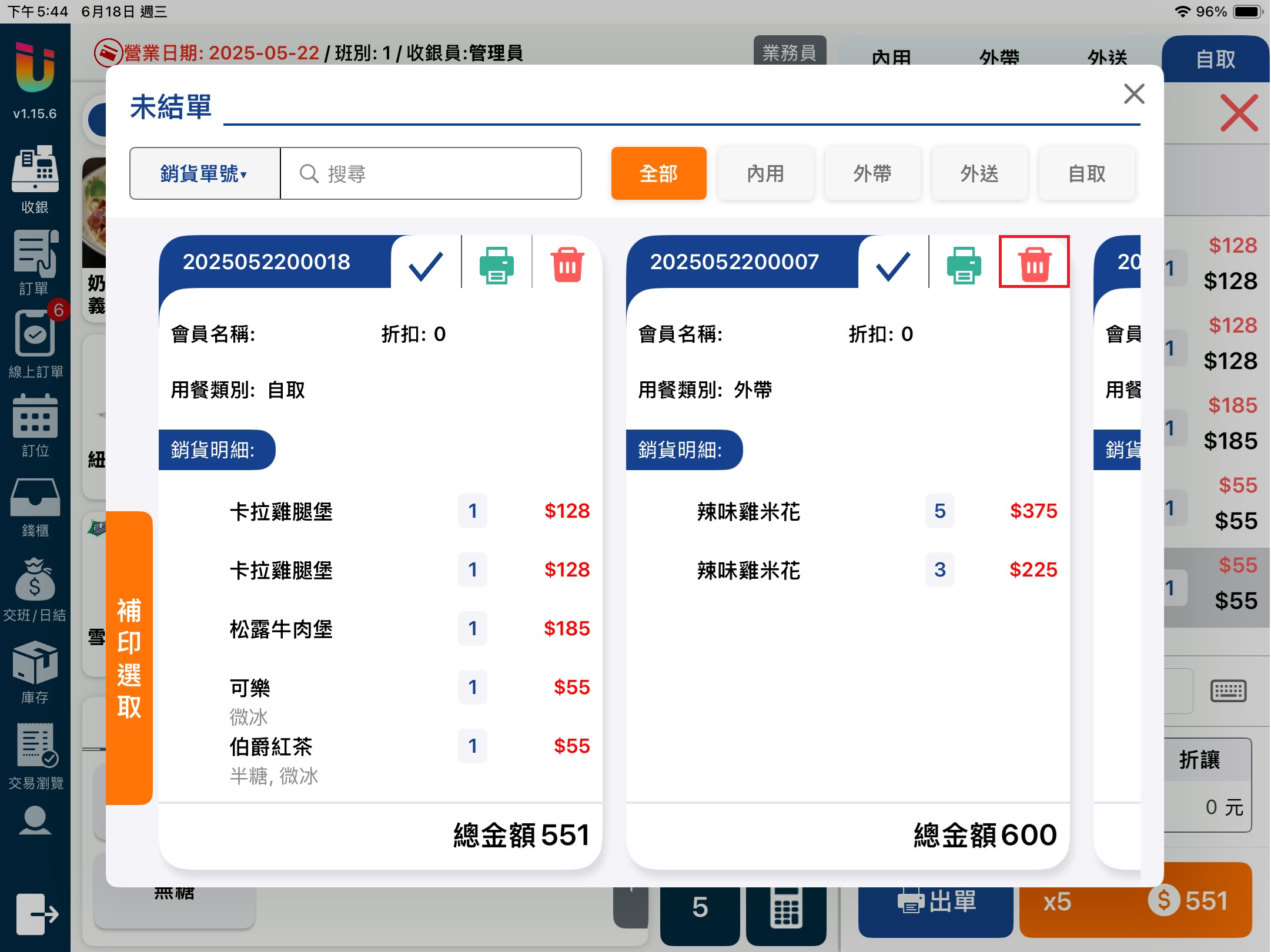 - 已結單據補印請至左方功能表的 [交易瀏覽] 進行補印