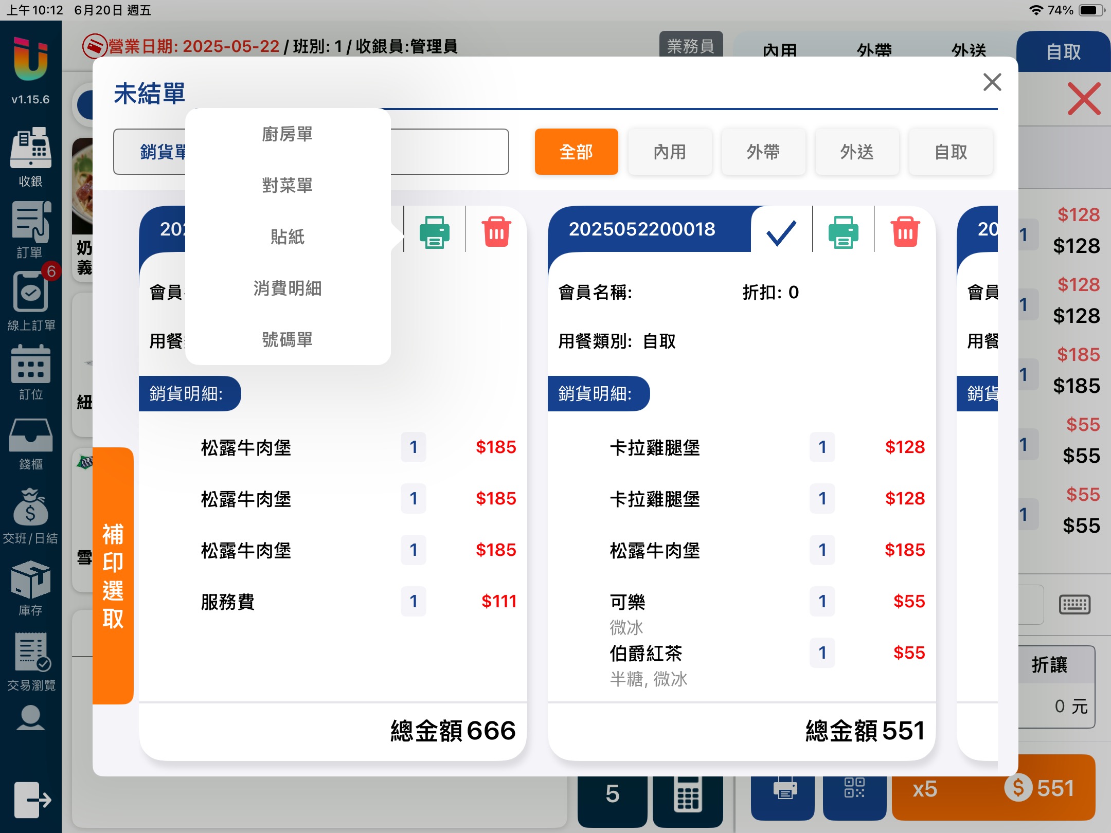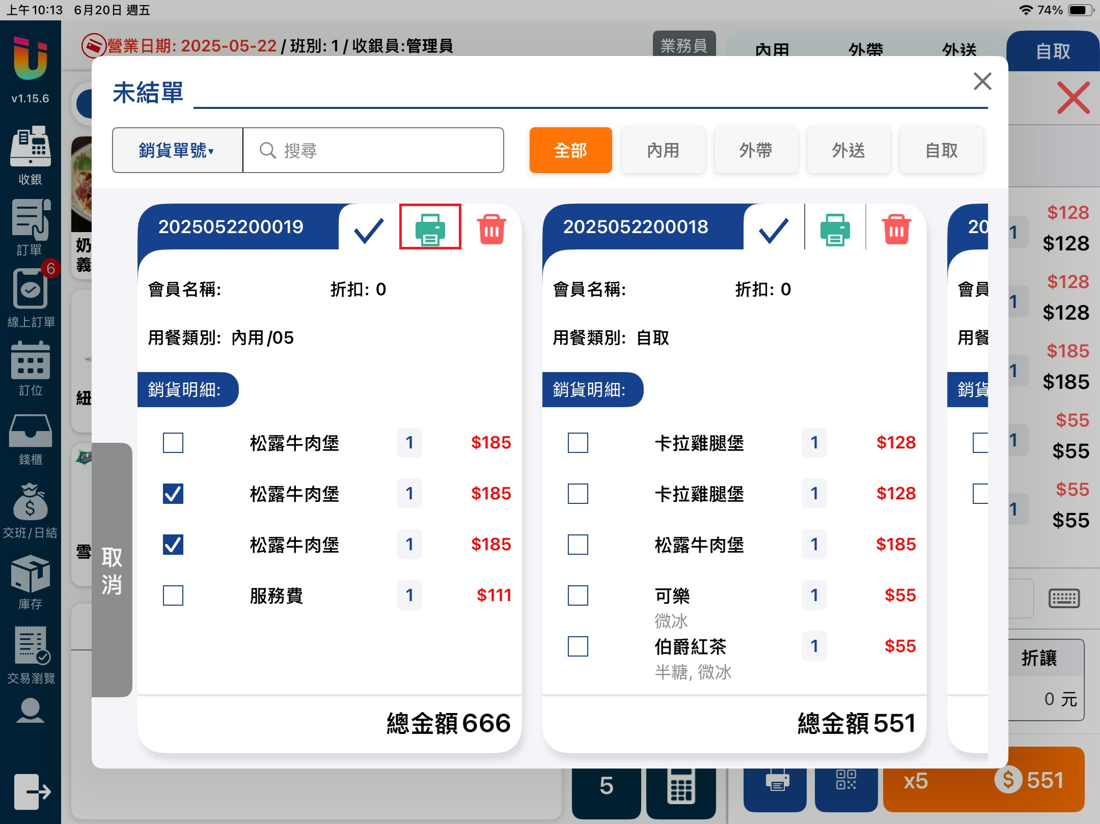 於 [點餐介面] 右上角單據資訊欄點擊 [單據號碼] 即可瀏覽目前所有的未結單。