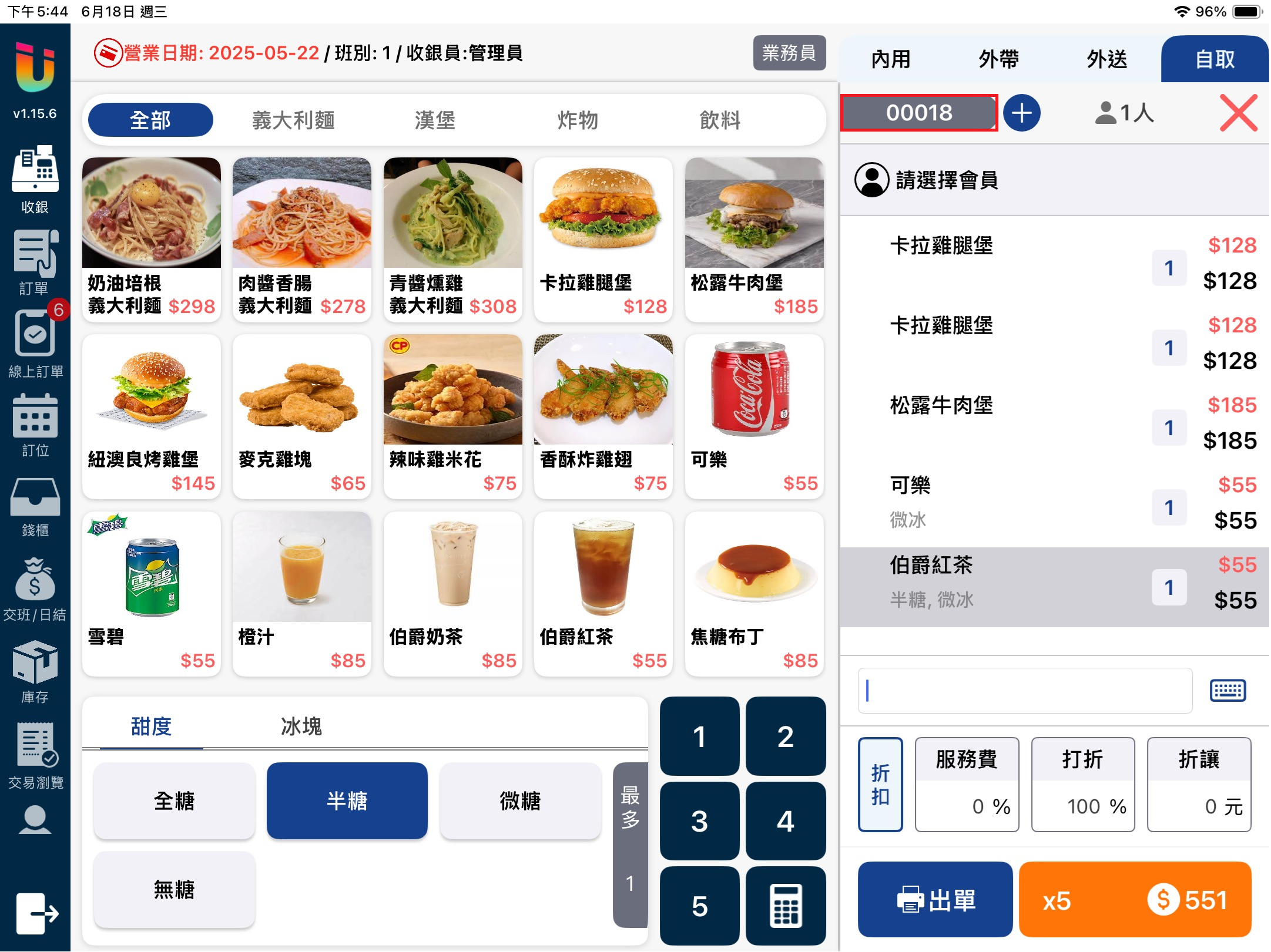 於 [點餐介面] 右上角單據資訊欄上會顯示該單據的 [單據號碼]。