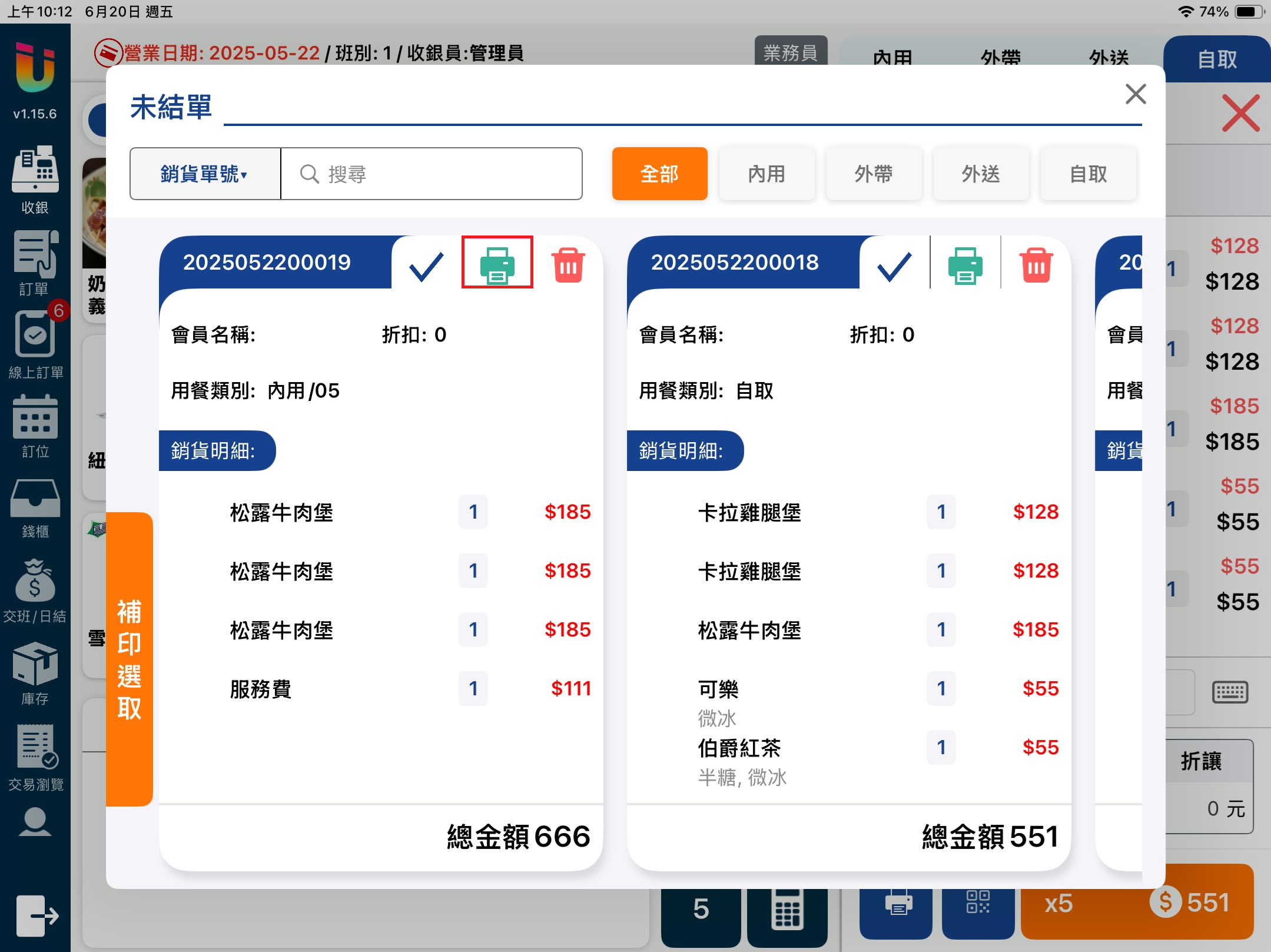 於 [未結單據瀏覽] 頁面點擊欲補印的未結單據上方的 [印表機] 按鈕並選擇欲補印的 [單據種類] 即可進行補印。
